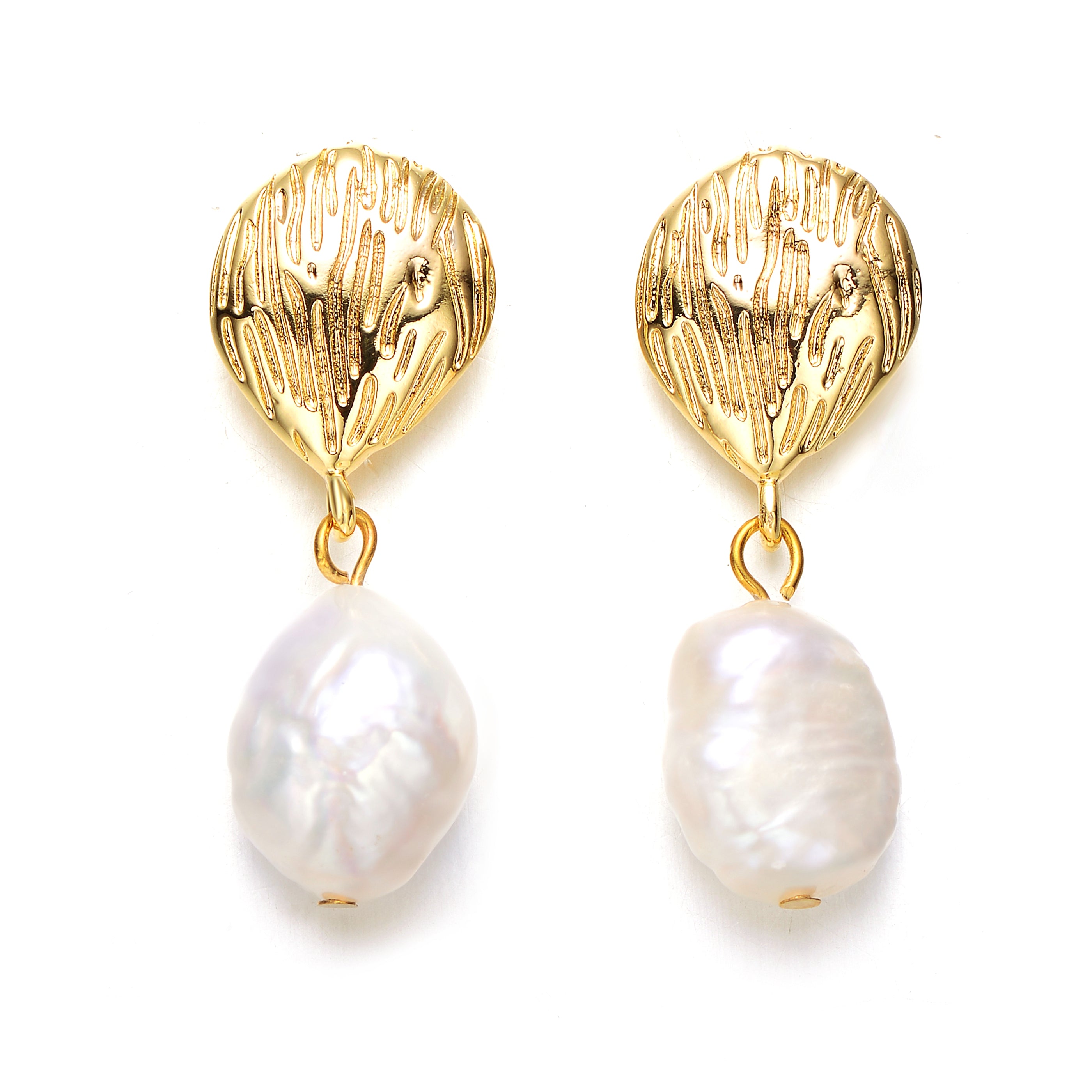 14k Yellow Gold Plated with Baroque Oval Genuine Freshwater White Pearl Coral Reef Dangle Earrings in Sterling Silver