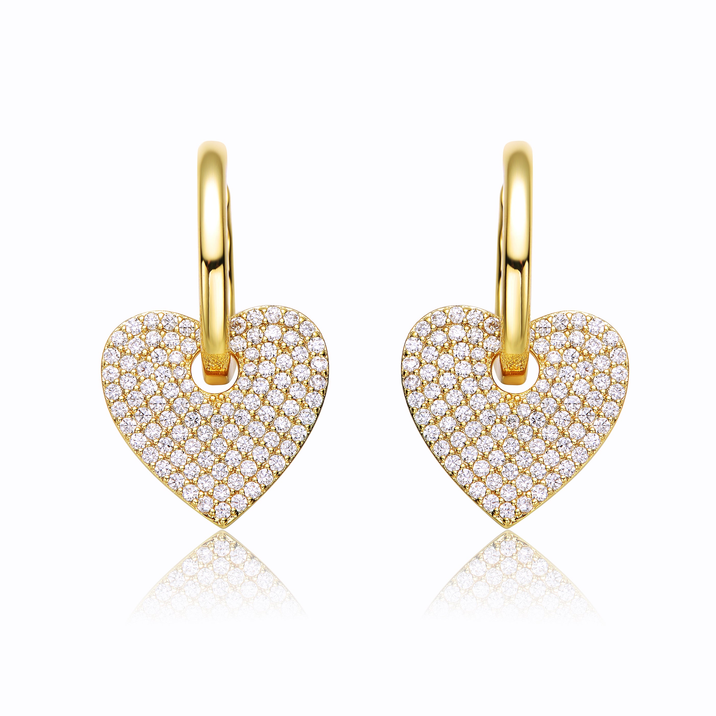 Teens/ Women 14k Gold Plated with Cubic Zirconia Heart Dangle Hoop Drop Earrings. Add these brightly polished 14k gold plated earrings to your day or night look, perfect for those who love hearts. Sparkling round brilliant cut cubic zirconia pave set on dropped heart charms add romance to these classic tubular hoops. Hinge backs provide an infinity fit to these hoops, allowing them to hug the earlobes comfortably when worn.