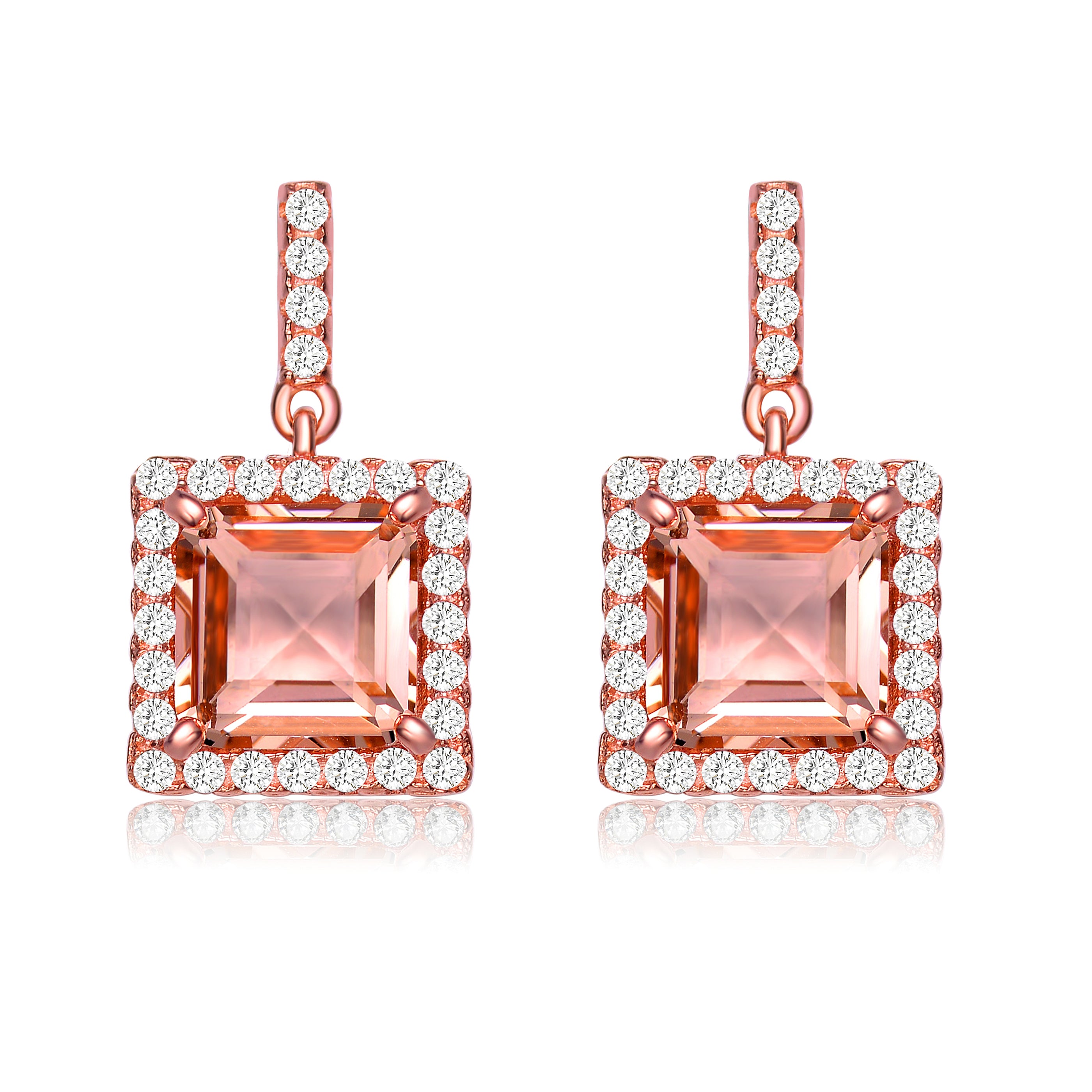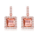 Be the definition of elegance when you own this 18K Rose Gold Plated overlay pair of earrings. A champagne colored evenly squared cubic zirconia is surrounded by clear cz's. Pulled back with Butterfly traditional backs to make them safe to wear, and hang around with these gifted earrings.