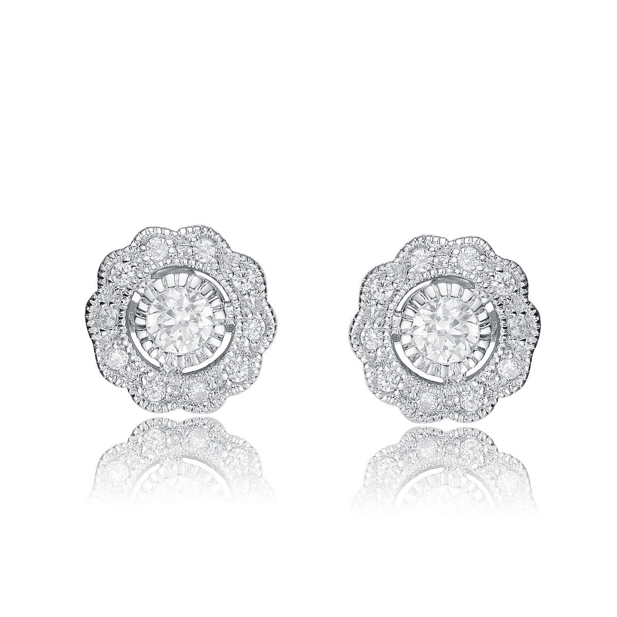 Elegant .925 Sterling silver cubic zirconia flower stud earrings. These lovely round floral stud earrings feature dazzling large clear round cut cubic zirconia stone in bezel set accented by small clear round cubic zirconia stones. Crafted of .925 Sterling silver in rhodium plating and secure with butterfly clasp.