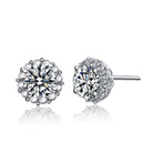 Stylish .925 Sterling silver cubic zirconia round stud earrings. These fine stud earrings feature clear dazzling round cut cubic zirconia stones outlined with smaller cubic zirconia stones. Crafted of .925 Sterling silver with rhodium plating and secure with butterfly closure. Also available in Rose Gold platting.