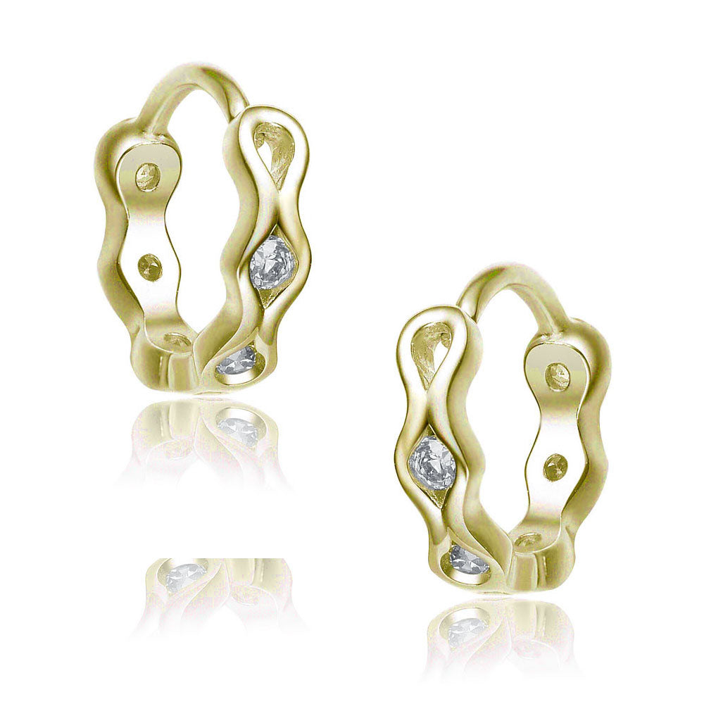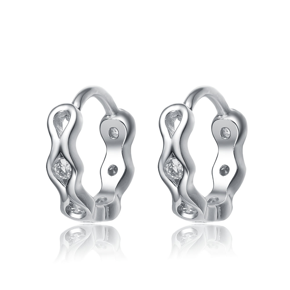 Stylish .925 Sterling silver cubic zirconia small round hoop earrings. These hoop earrings feature bezel set small clear round cubic zirconia stones along the outer edges. Crafted of .925 Sterling silver in rhodium plating and secure with saddle back.