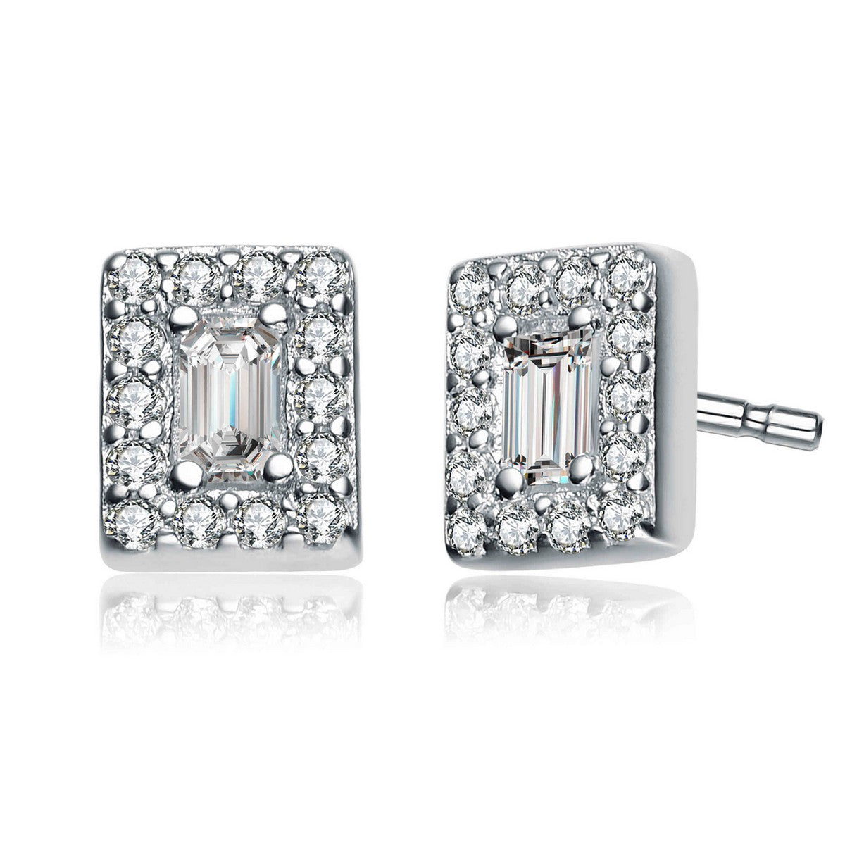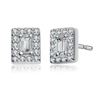 Stylish .925 Sterling silver cubic zirconia square stud earrings. The clear emerald cut cubic zirconia poises at the center of these rectangular earrings accented by small clear round cubic zirconia stones. Crafted of .925 Sterling silver in rhodium plating and secure with butterfly clasps.