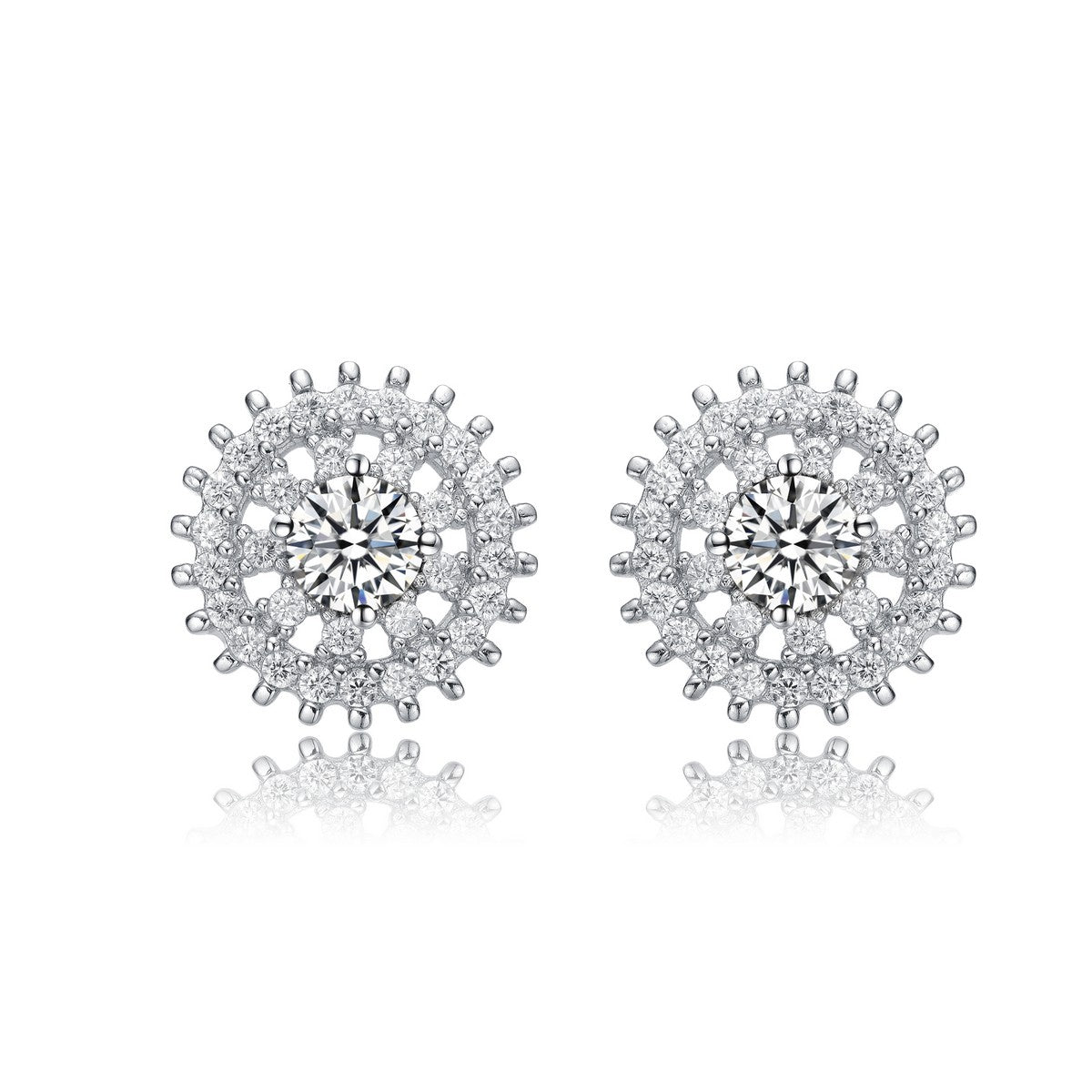 Fashionable and elegant wreath stud earrings. This flower shape designs features center of clear round cubic zirconia and smaller round cubic zirconia accents. This pair is set in .925 Sterling silver with rhodium plated and has a butterfly closure.