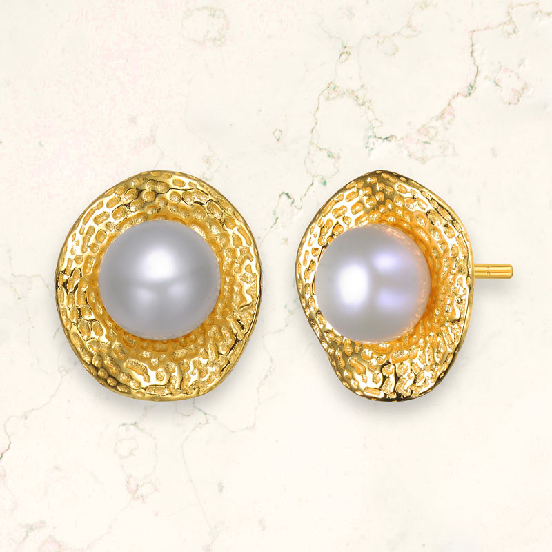 Very elegant .925 Sterling silver gold plated with freshwater pearl hammered earrings. These earrings feature design made out of round freshwater pearl set in the center of the curvy hammered gold metal frame. Crafted in .925 Sterling silver with gold plating and it is secured with a butterfly closure. This item is great addition to any outfit. Makes a great gift as well.