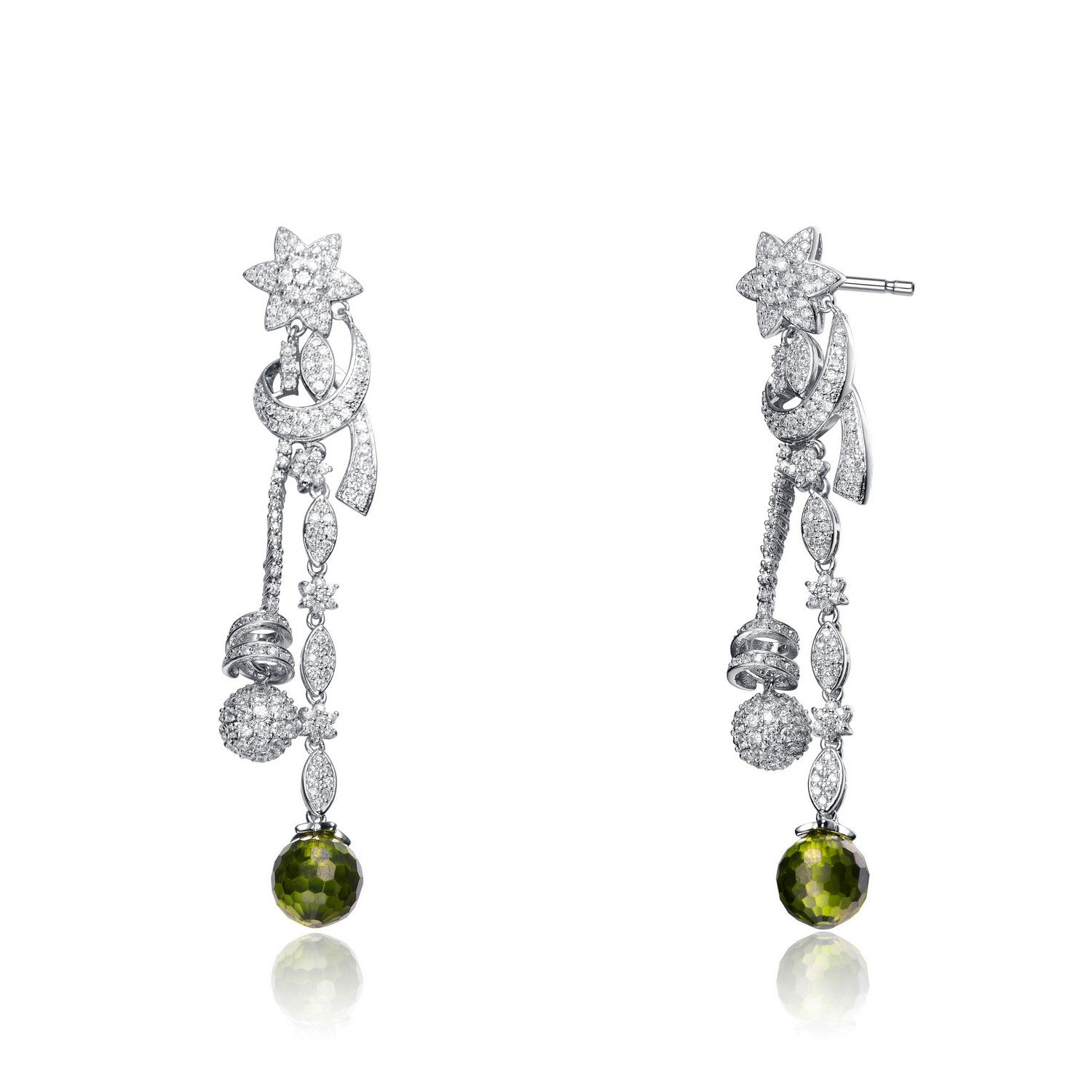 Elegant .925 Sterling silver green cubic zirconia two strand earrings. These earrings feature round clear and green large cubic zirconia stones for a glorious dangle style. Crafted of .925 Sterling silver these earrings secure with butterfly closure.