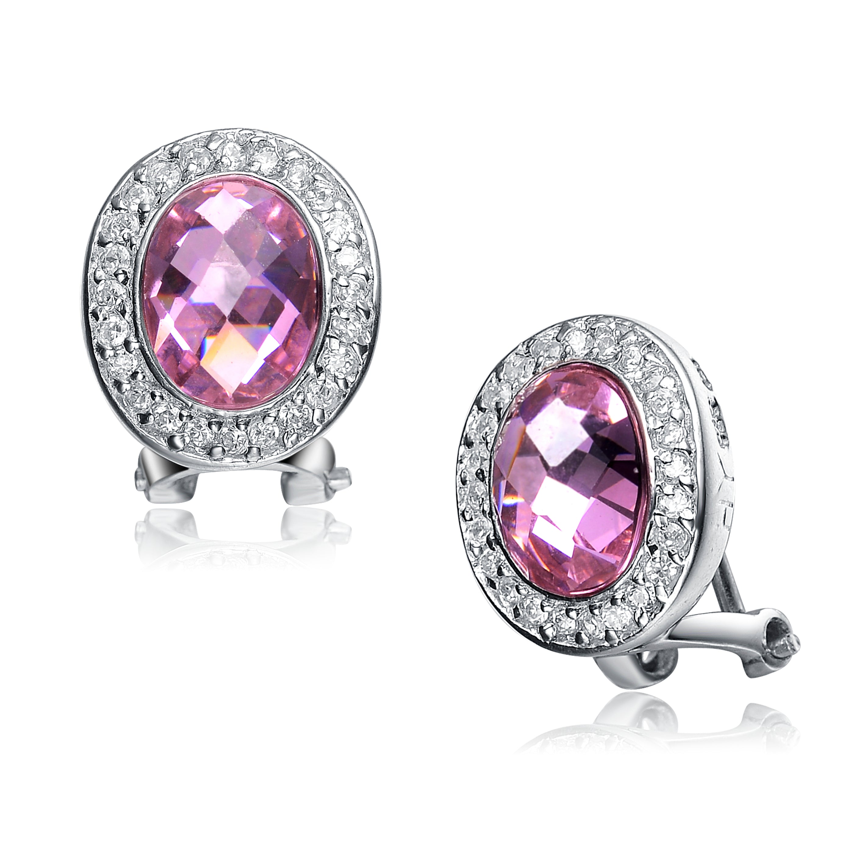 Stylish .925 Sterling silver cubic zirconia stud earrings. These earrings feature sparkling pink cubic zirconia set in a .925 Sterling silver frame accented by small clear round cubic zirconia stones. Crafted of .925 Sterling silver with rhodium plating and secure with omega clasps.