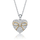 Stylish .925 Sterling silver with rhodium and gold plated and clear cubic zirconia heart necklace. The design features center of gold plated bow tie surrounded by clear round cubic zirconia stones paved on metal base forming a heart shape. This necklace is .925 Sterling silver with rhodium and gold plating and has a spring ring closure. Makes a great gift as well.