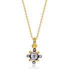 This is a whimsical .925 Sterling silver pendant with a cross flower design. There is a large white cubic zirconia stone that is surrounded by smaller white stones and gold-plated details on its edges; it has a gold-plated clasp and slender necklace chain.
