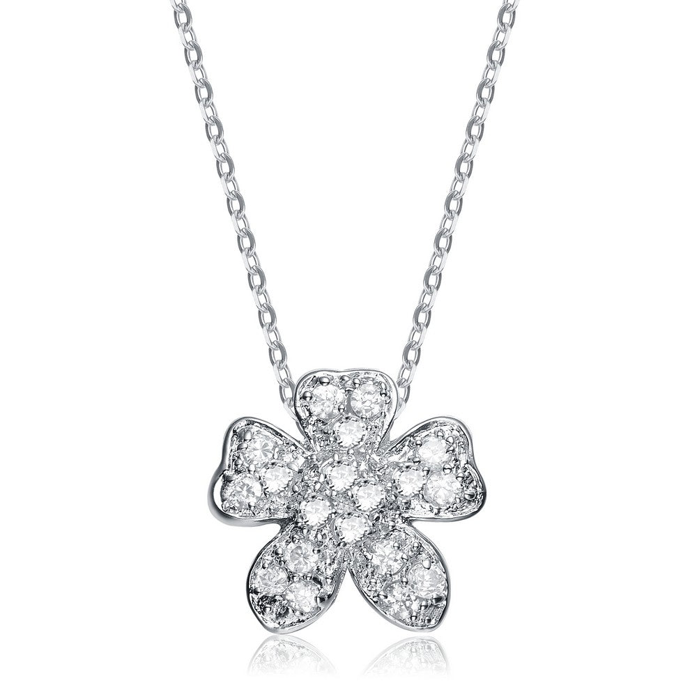 This necklace shows a beautiful combination of white cubic zirconia and .925 Sterling silver working together in perfect harmony. The floral shape works in its simplicity and has an evergreen charm to it that works well any time.
