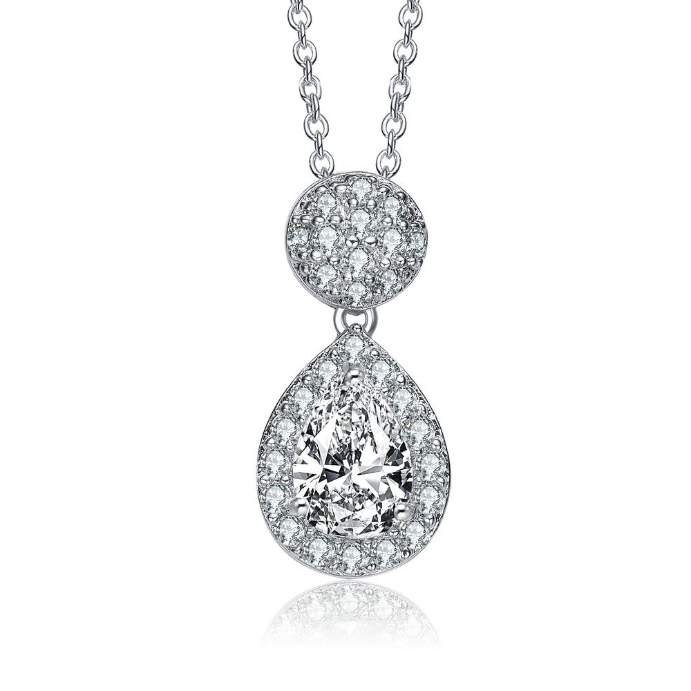 A simple yet stunning pendant necklace sparkles and shines with a clear pear cubic zirconia centerpiece haloed with clear round cubic zirconia and accented with a large round trinket fully paved with clear round cubic zirconia on top. Crafted in .925 Sterling silver with rhodium plated this necklace has a spring ring closure.