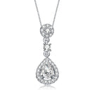 Show off with this stylish drop pendant necklace. This necklace features pear shaped frame studded with small clear round cubic zirconia and a pear cubic zirconia in the center of the frame. The upper part consists of round cubic zirconia and halo with clear round cubic zirconia. This necklace is set in .925 Sterling silver with rhodium plated and has a spring ring closure.