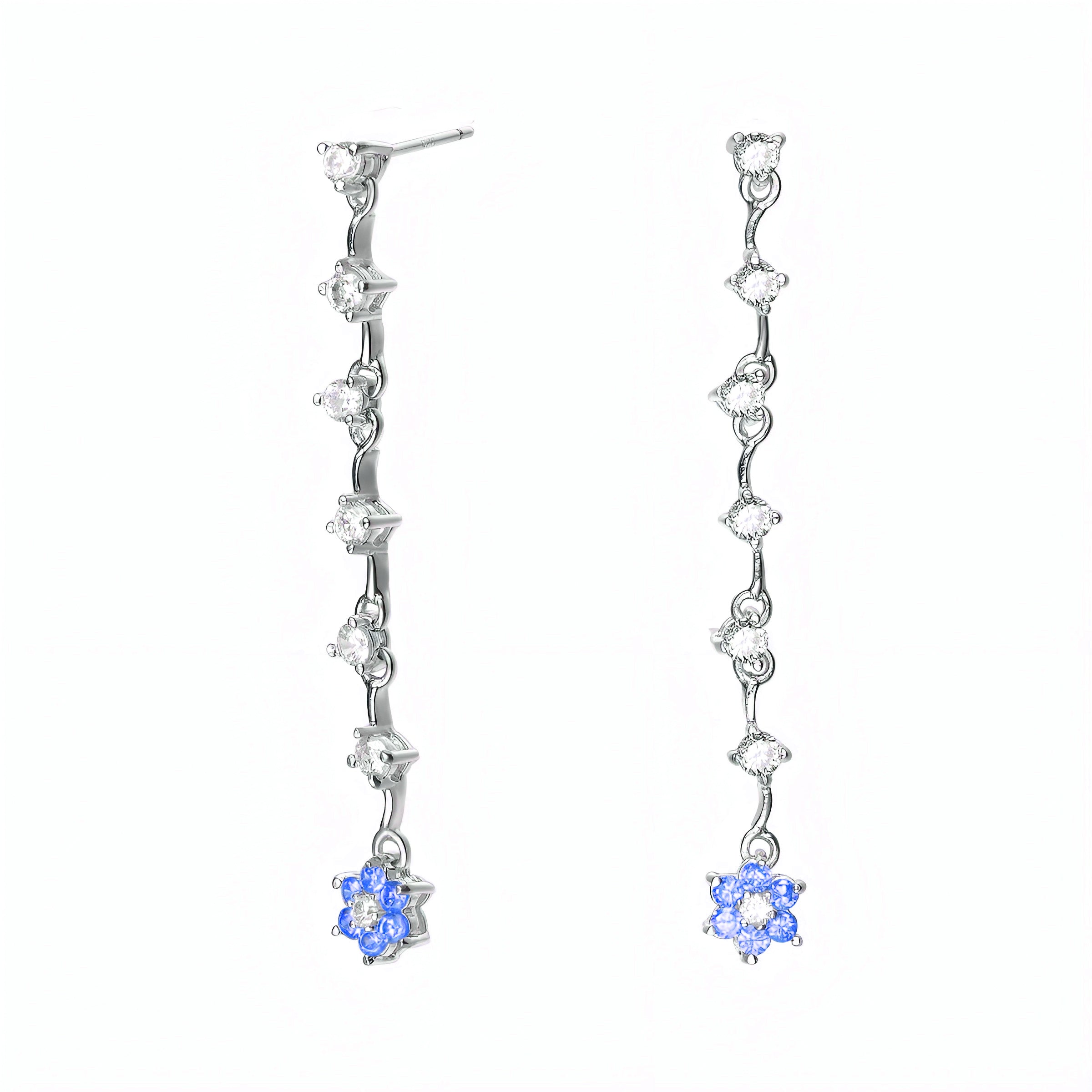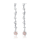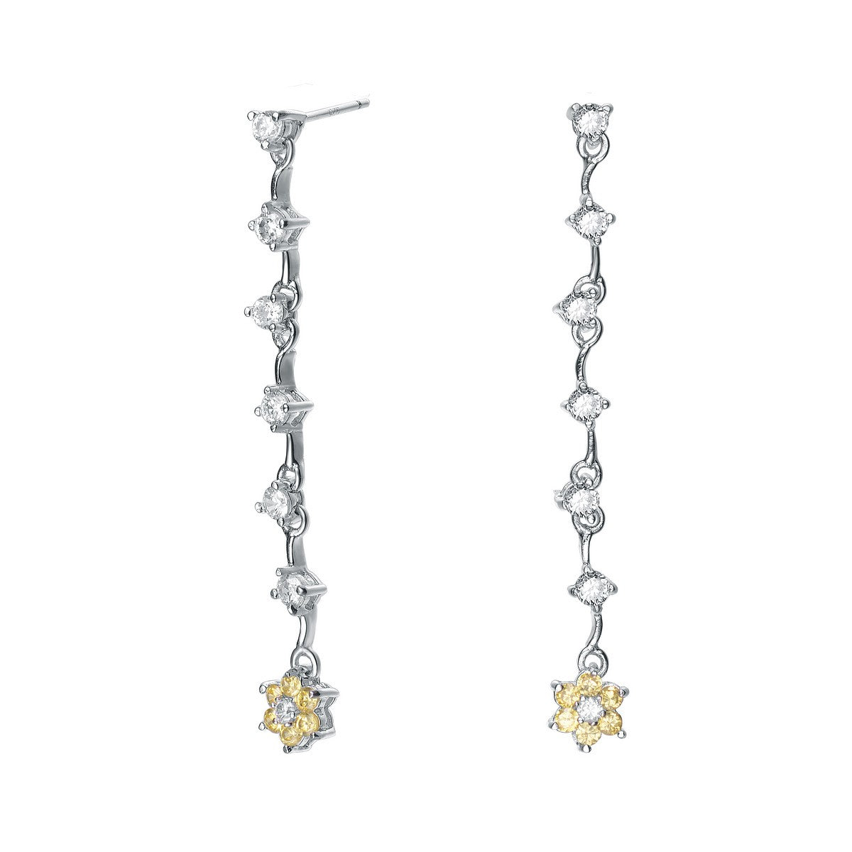 Sweet and fun these dangling yellow stud earrings are perfect. Each set features clear cubic zirconia stones set on silver frame with a yellow round cubic zirconia stone on the bottom forming flower shape. .925 Sterling silver with rhodium plating and secure with butterfly clasps.