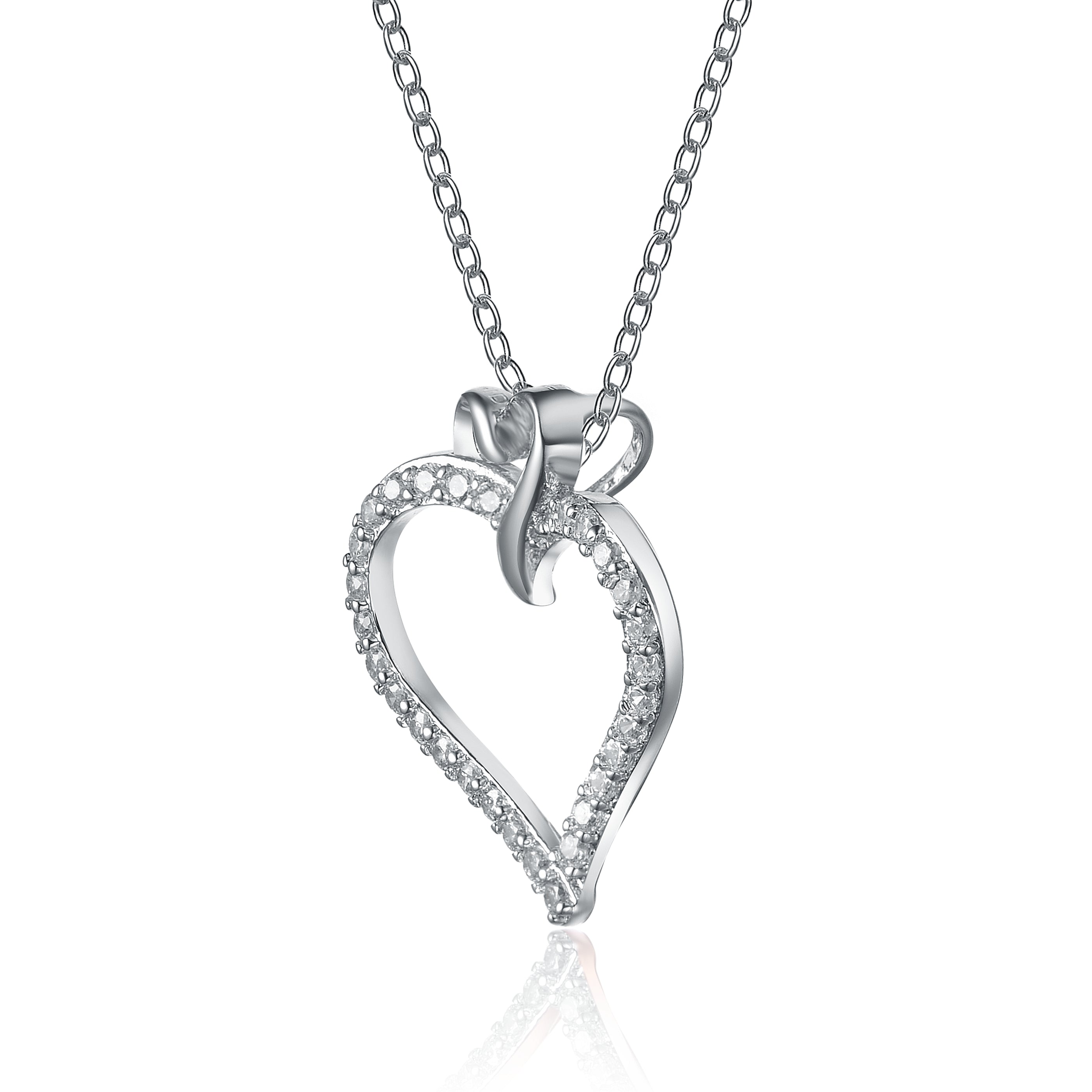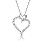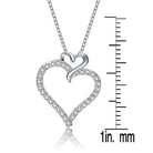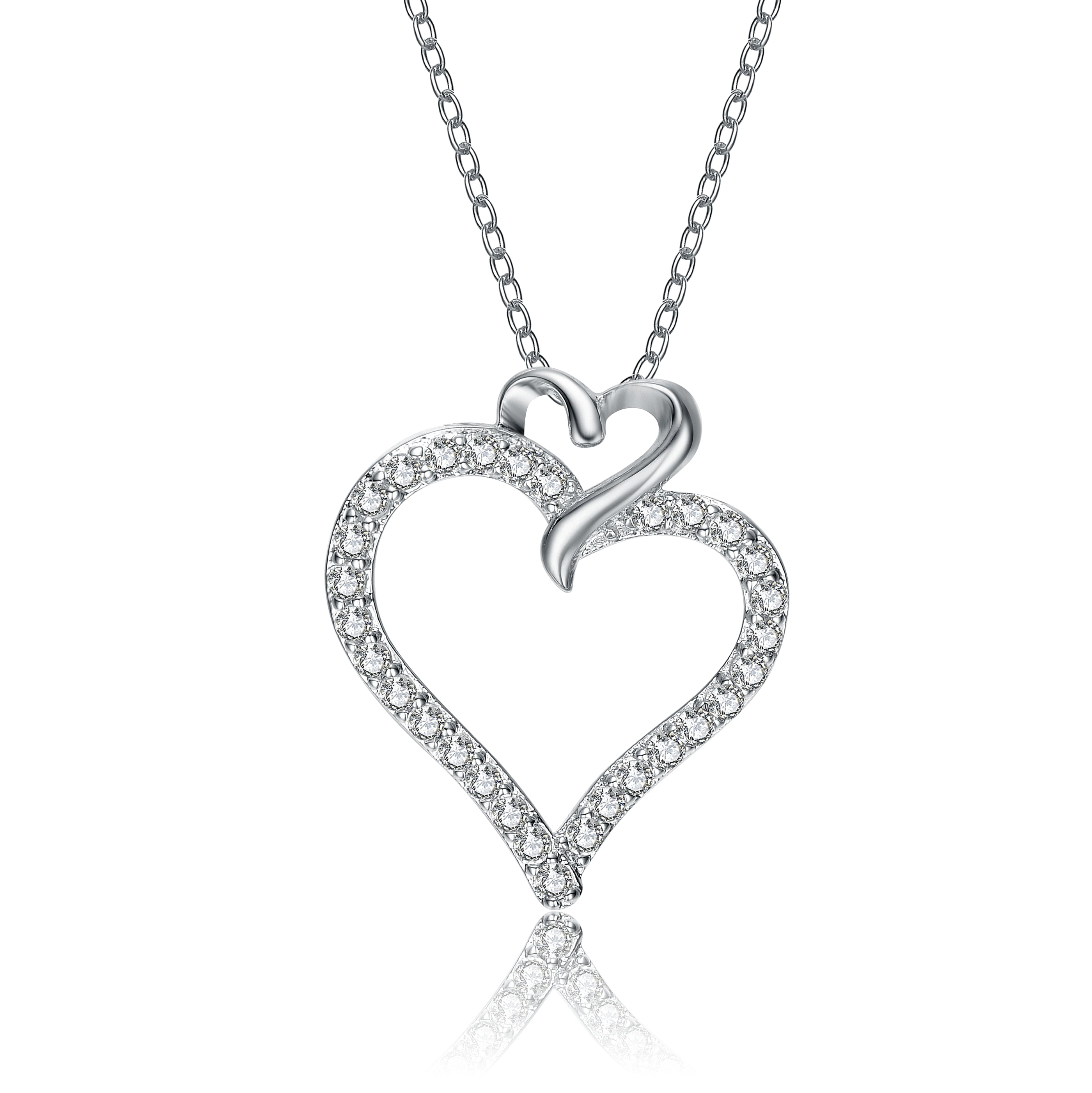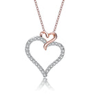 This lovely double heart pendant is decorated with dazzling white round-cut cubic zirconia stones. Crafted of .925 Sterling silver, with rose and black plating the necklace secures with a spring ring clasp.