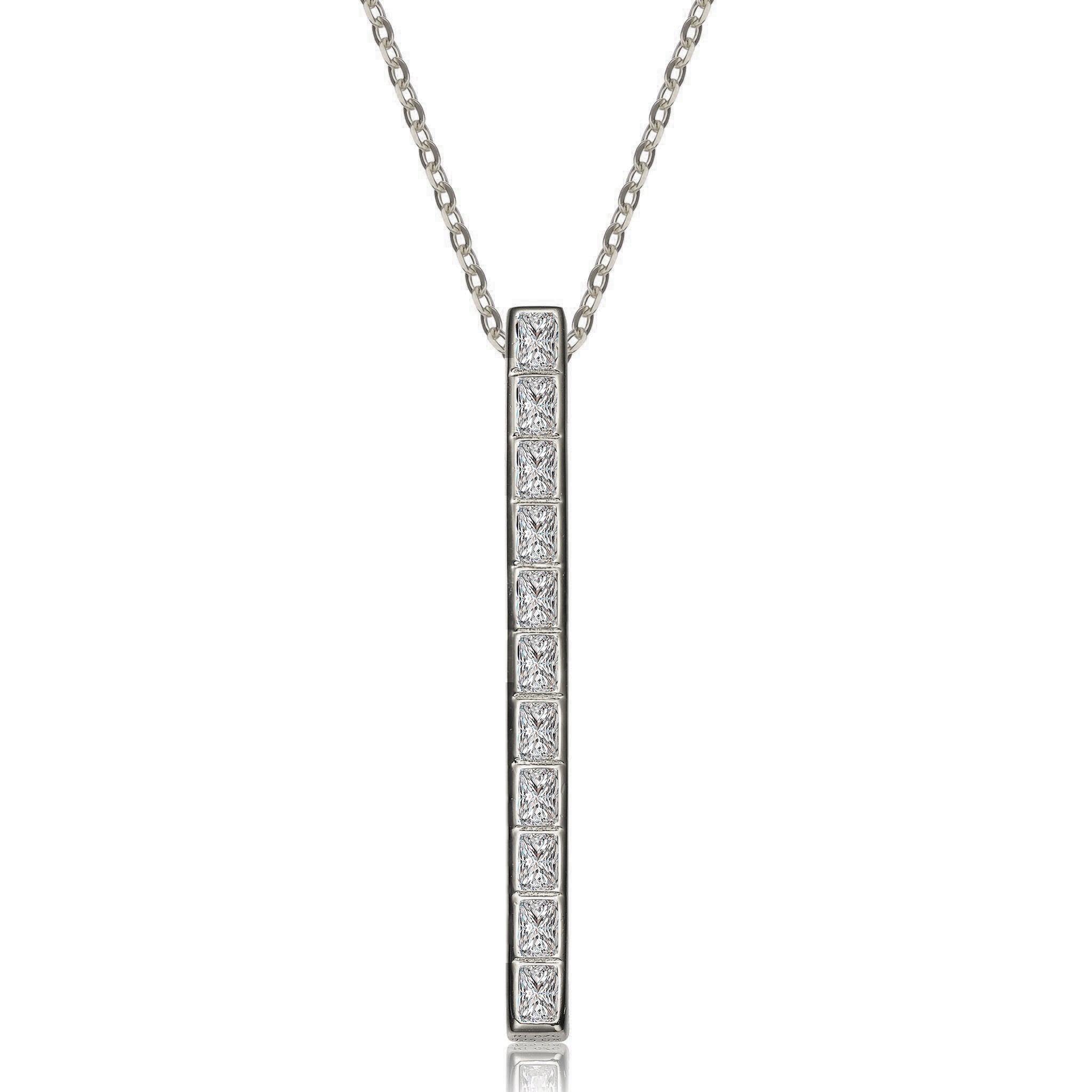 This sophisticated pendant features a sleek, vertical bar design, meticulously crafted from black-plated sterling silver. The bar is adorned with a row of sparkling cubic zirconia stones, each precision-cut to maximize brilliance and create an eye-catching display of light. The pendant hangs gracefully from a matching silver chain, making it a versatile accessory for both casual and formal occasions. Its timeless elegance and modern simplicity make it an ideal gift or addition to any jewelry collection.
