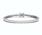 Classy Sterling Silver Rhodium Plated Tennis Bracelet.This simple yet skillfully crafted tennis bracelet features small and larger clear emerald cut Cubic Zirconia changing alternately. Crafted in Sterling silver with Rhodium plated and secures with a box clasp. Wear this piece as a glitzy accent to a casual look.