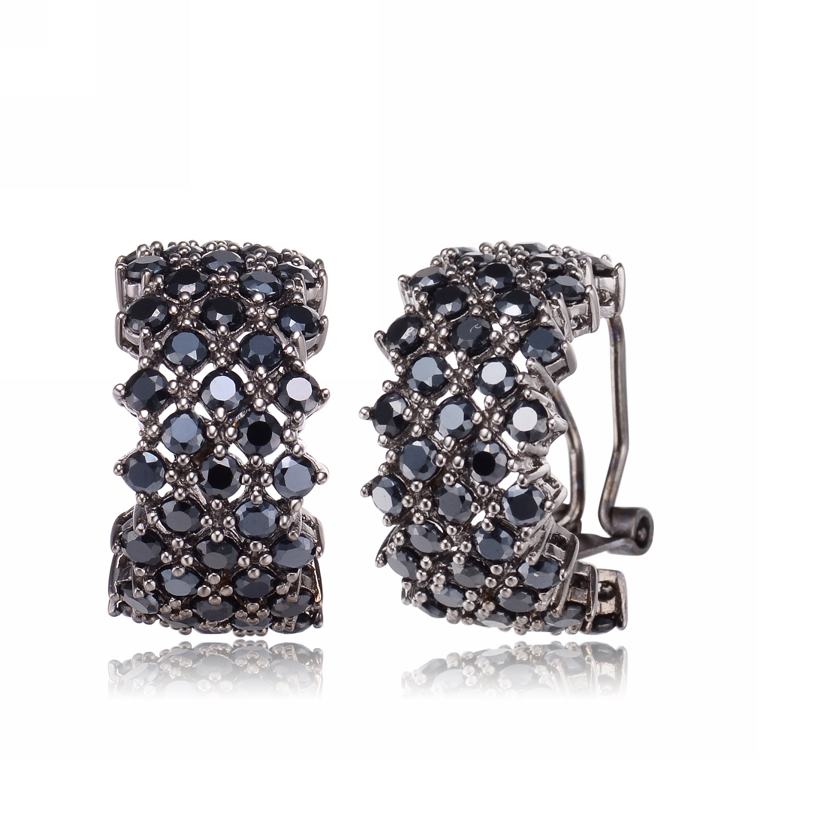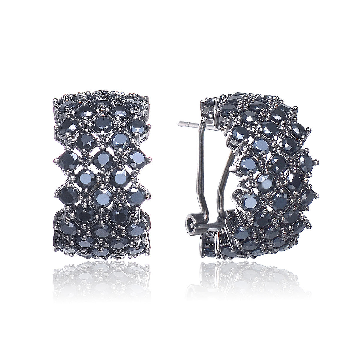 These earrings feature multiple columns of bold black cubic zirconia stones along the front. Each earring is crafted of black-plated sterling silver and fastens with omega closure.