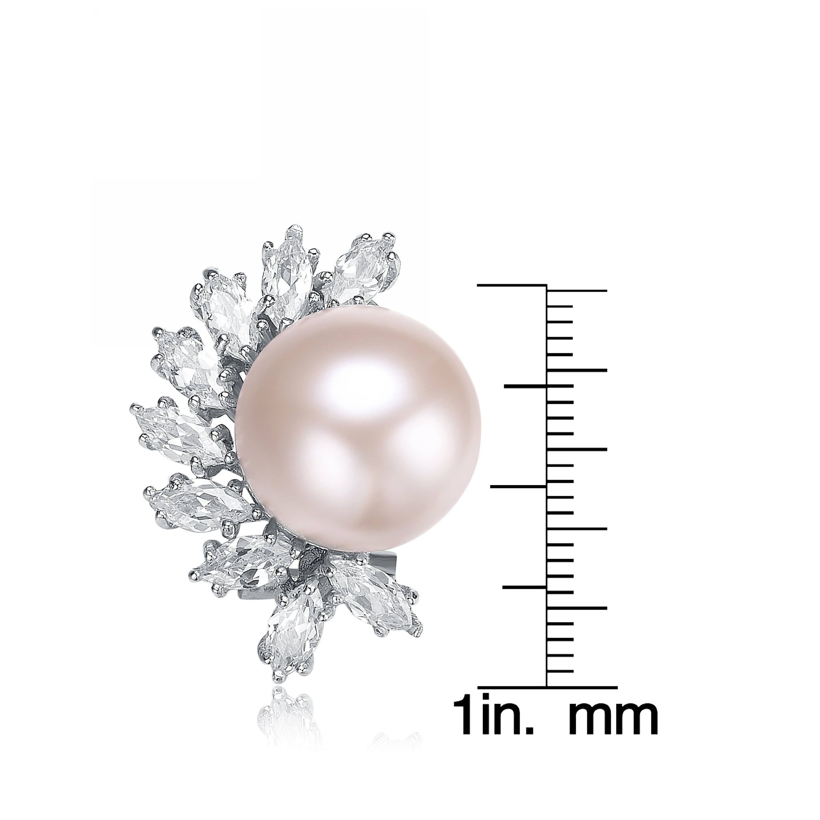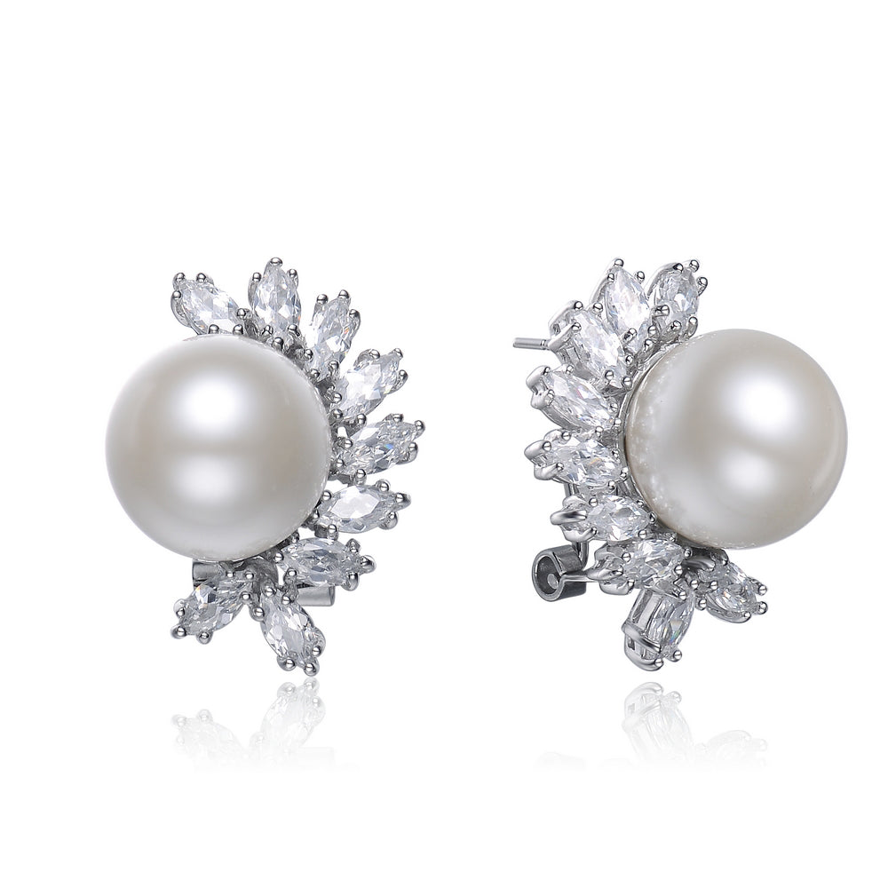 Gleaming white faux pearls light up these earrings, surrounded by marquise-cut clear cubic zirconia gemstones. The earrings are crafted of .925 sterling silver with rhodium plating and secure with omega clasps.