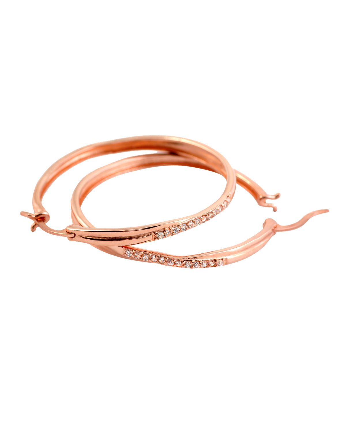 Rose gold plated laerge hoop earrings. Crafted from .925 sterling silver. Adorned with beautifully round cut cubic zirconia.