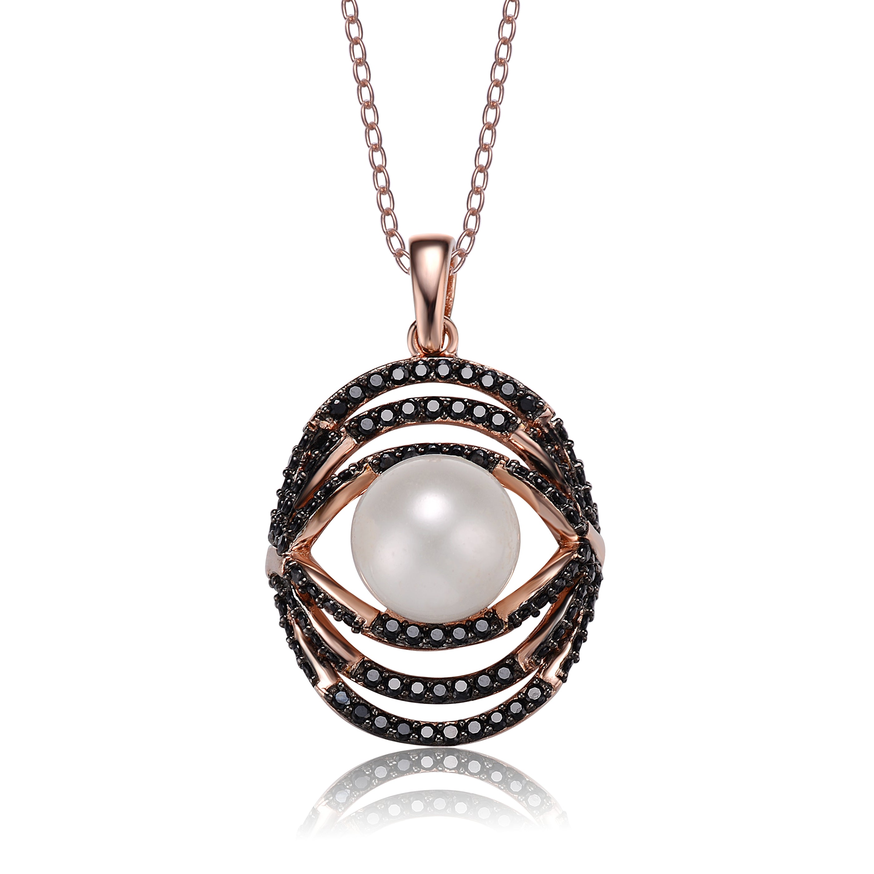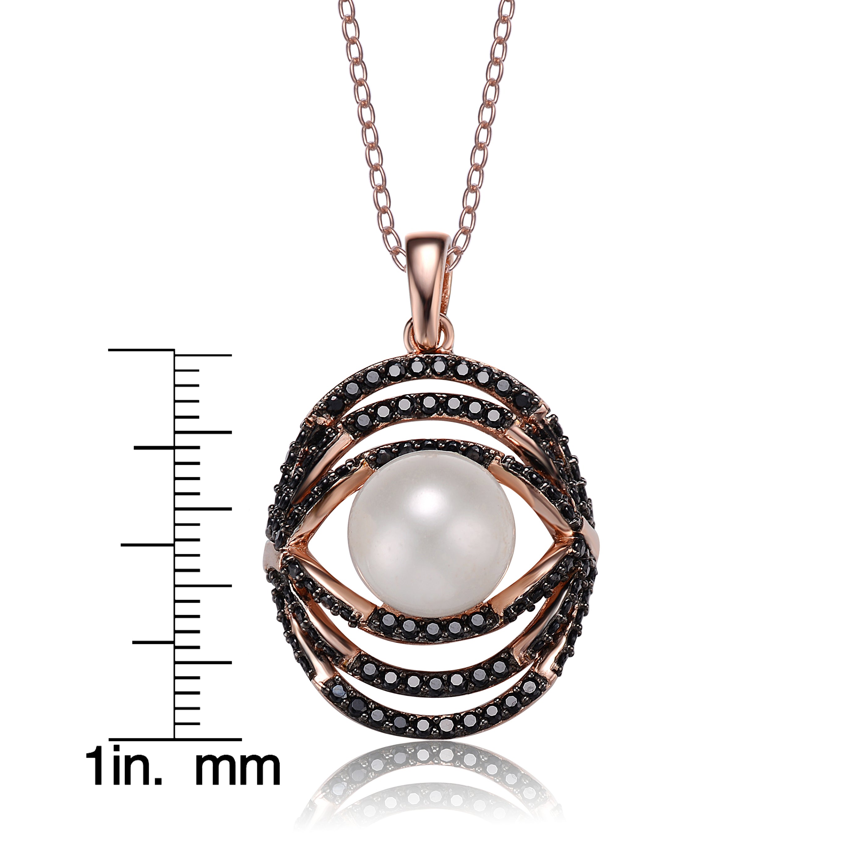 This dainty pendant features a white Freshwater pearl enhanced with black round-cut cubic zirconia stones. Crafted of .925 sterling silver with rose and black plating, the necklace secures with a spring ring clasp.