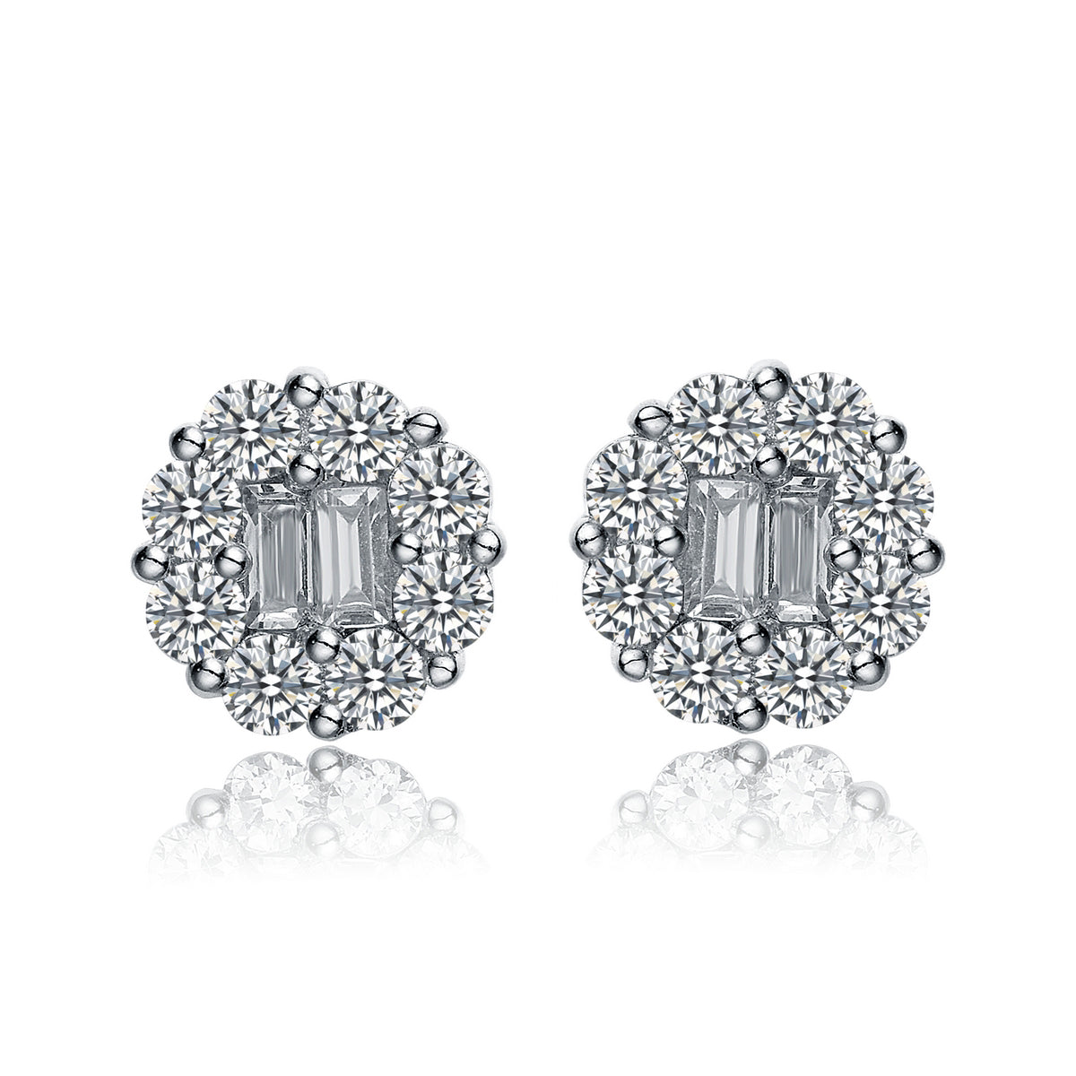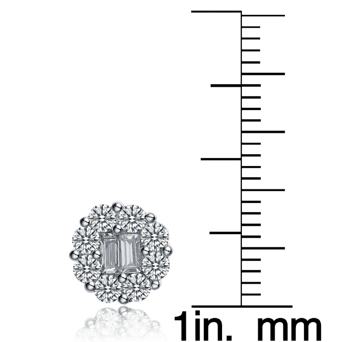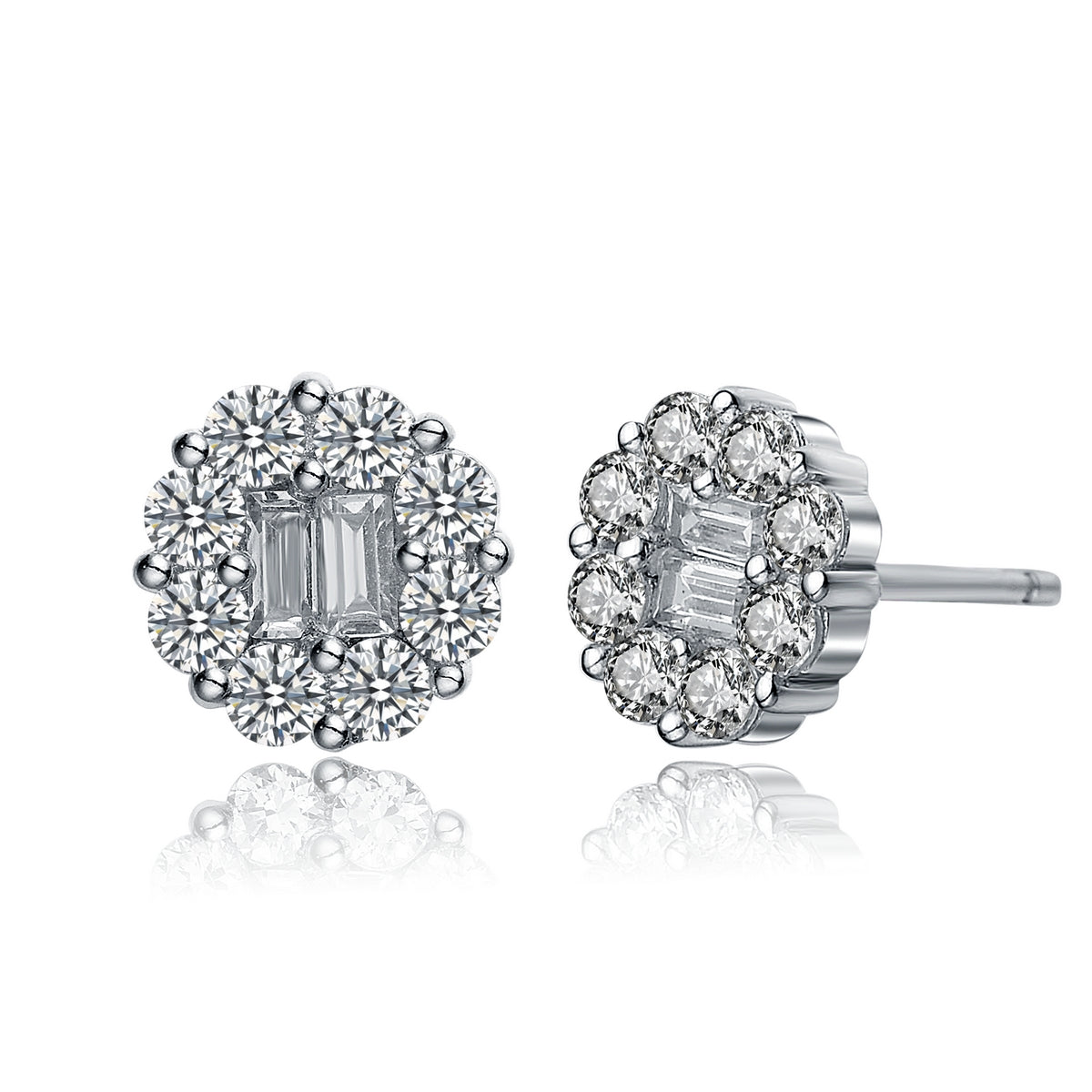 These dainty stud earrings are decorated with white round-cut cubic zirconia stones and baguettes. Crafted of .925 sterling silver, these beautiful earrings secure with butterfly clasps.