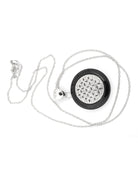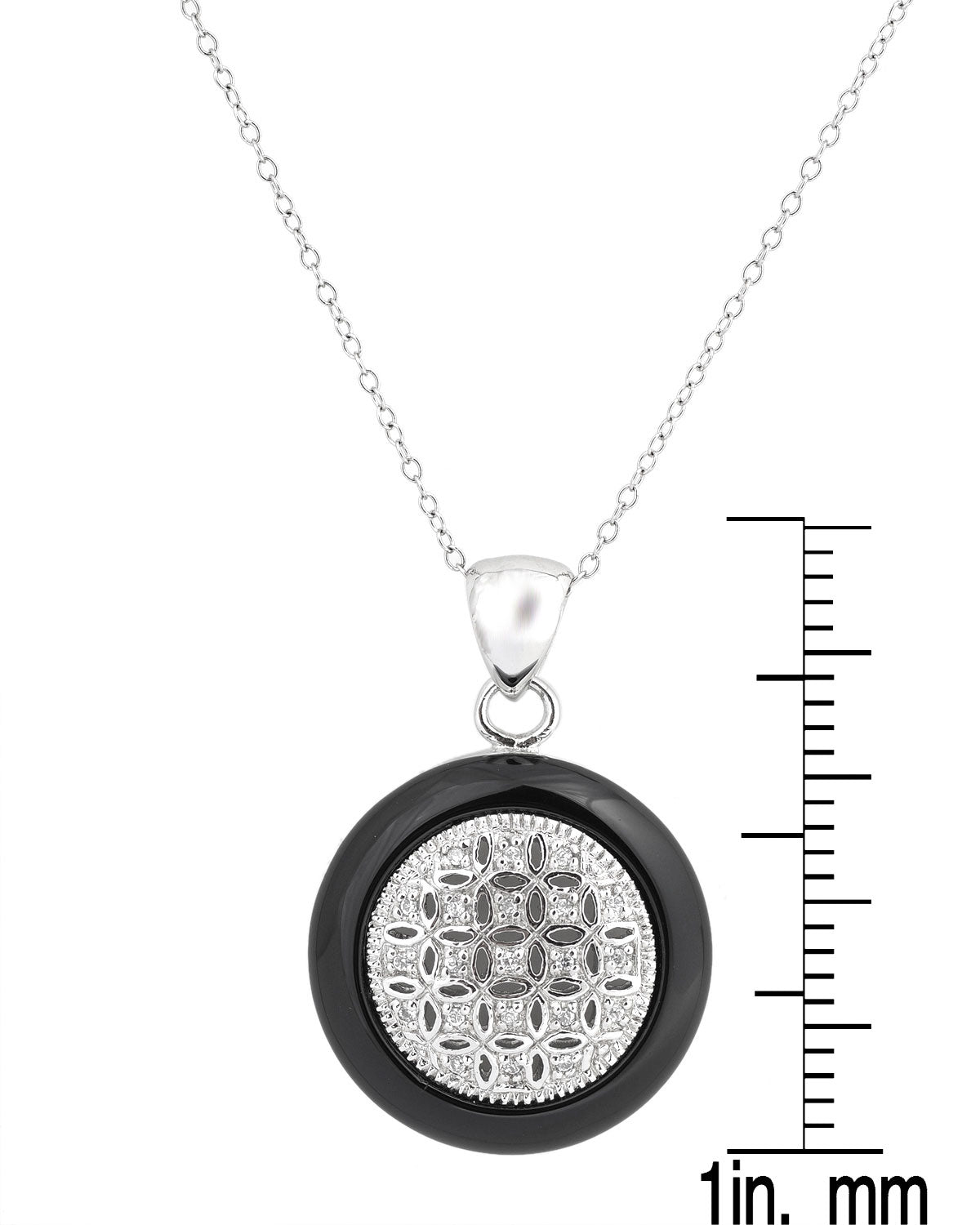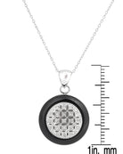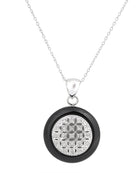 This elegant pendant features a sophisticated lace design crafted from sterling silver and plated with rhodium for a durable, tarnish-resistant finish. The pendant showcases a striking black backdrop that beautifully contrasts with the intricate silver lace pattern. At the center of the design, multiple cubic zirconia stones add a touch of sparkle, enhancing the pendant’s luxurious appeal. Suspended from a delicate sterling silver chain, this pendant is perfect for adding a touch of elegance to any outfit, making it a versatile accessory for both formal and casual occasions.