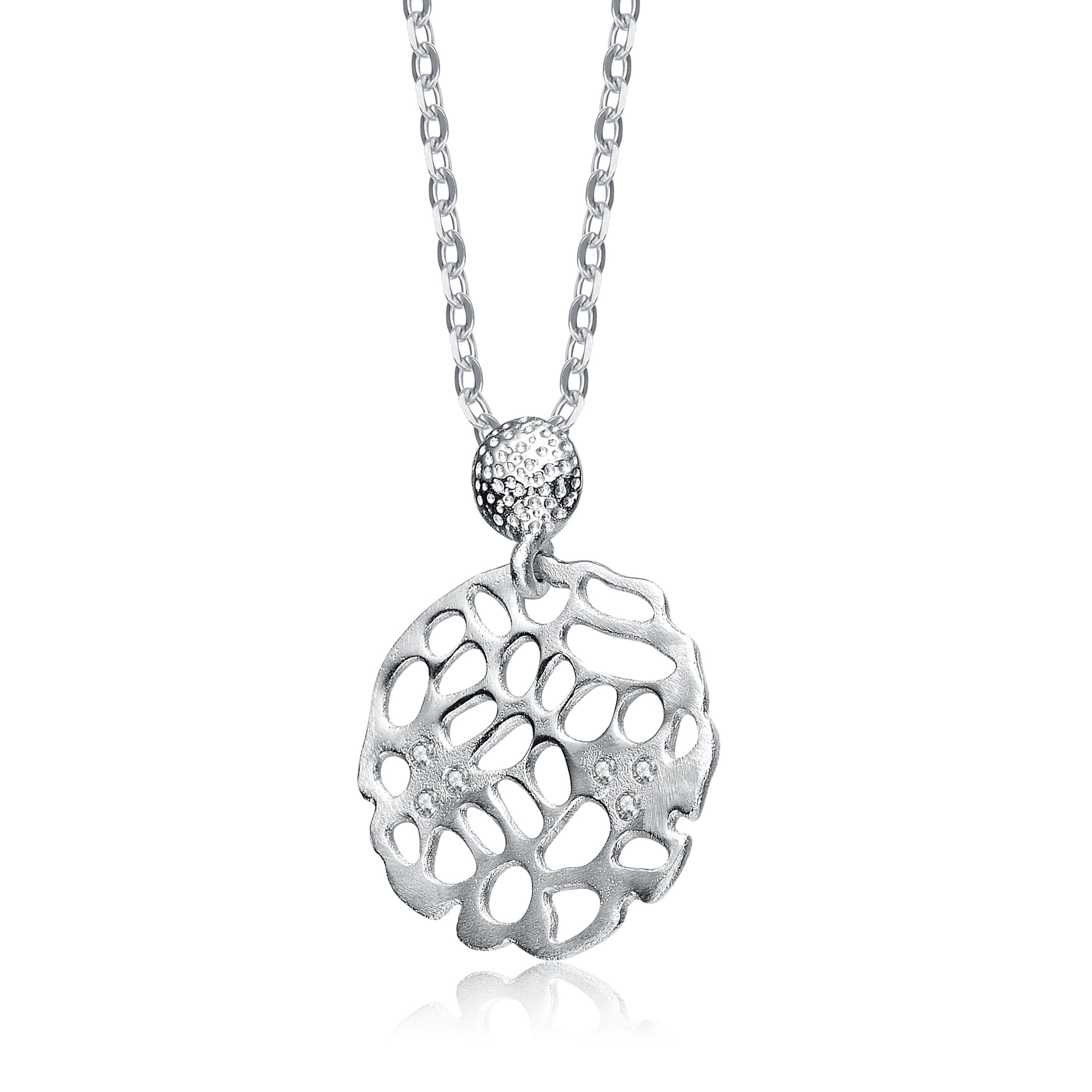 This sterling silver pendant on this necklace dances to a curvy mold. The pendant is marked with gracefully holed out spaces and armed with shiny pellets of cubic zirconia. Connecting it to its sterling rolo chain is a rounded silver piece with boldly rounded indents for decor.