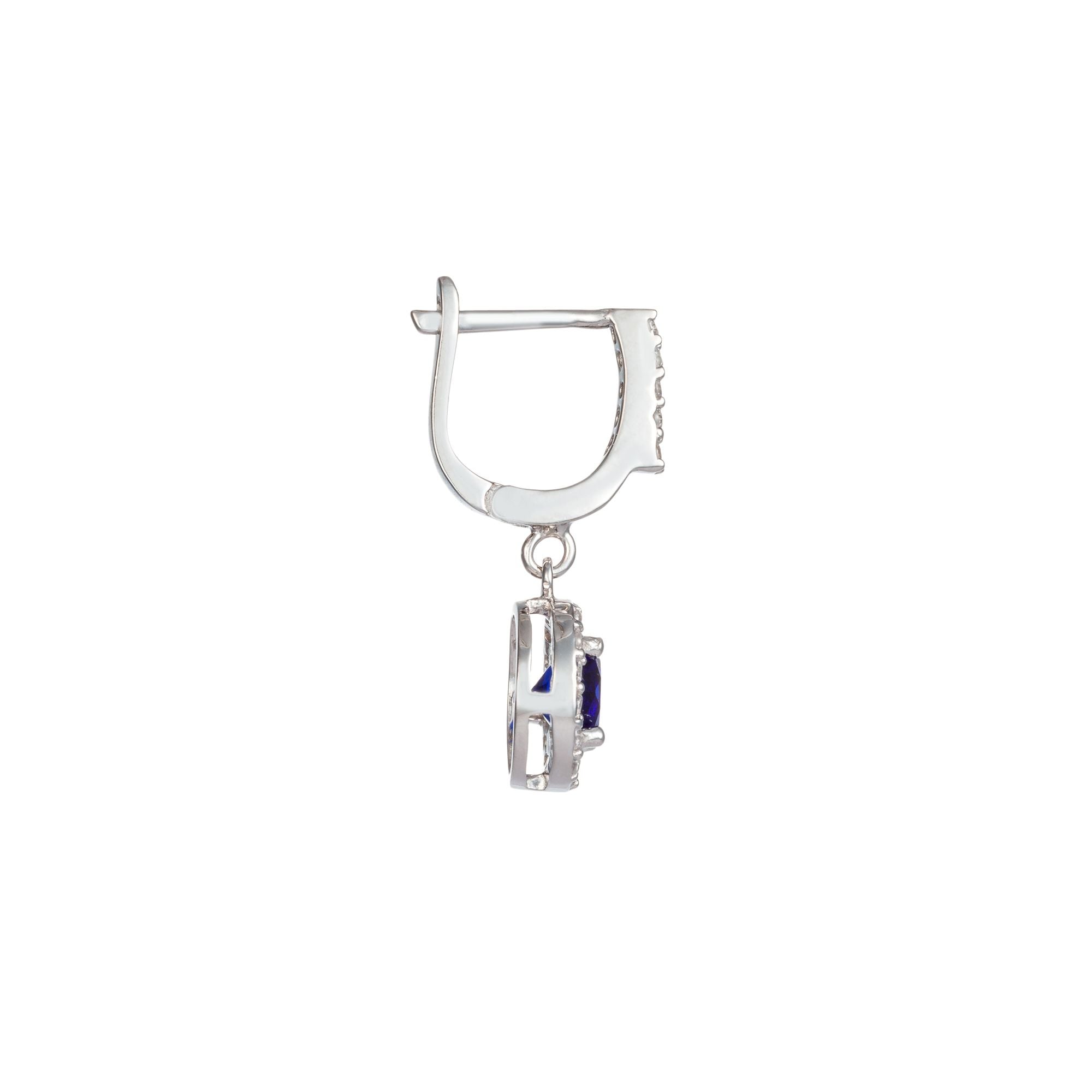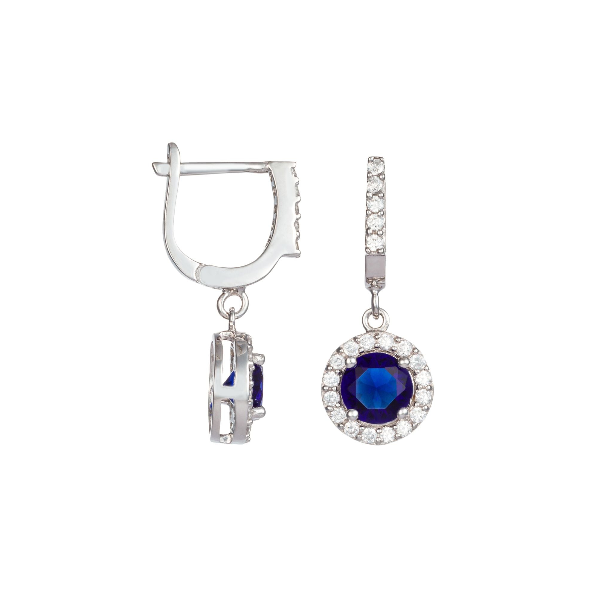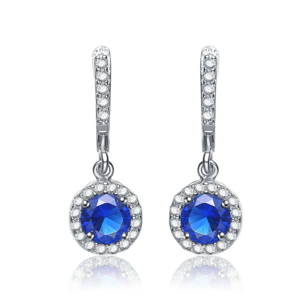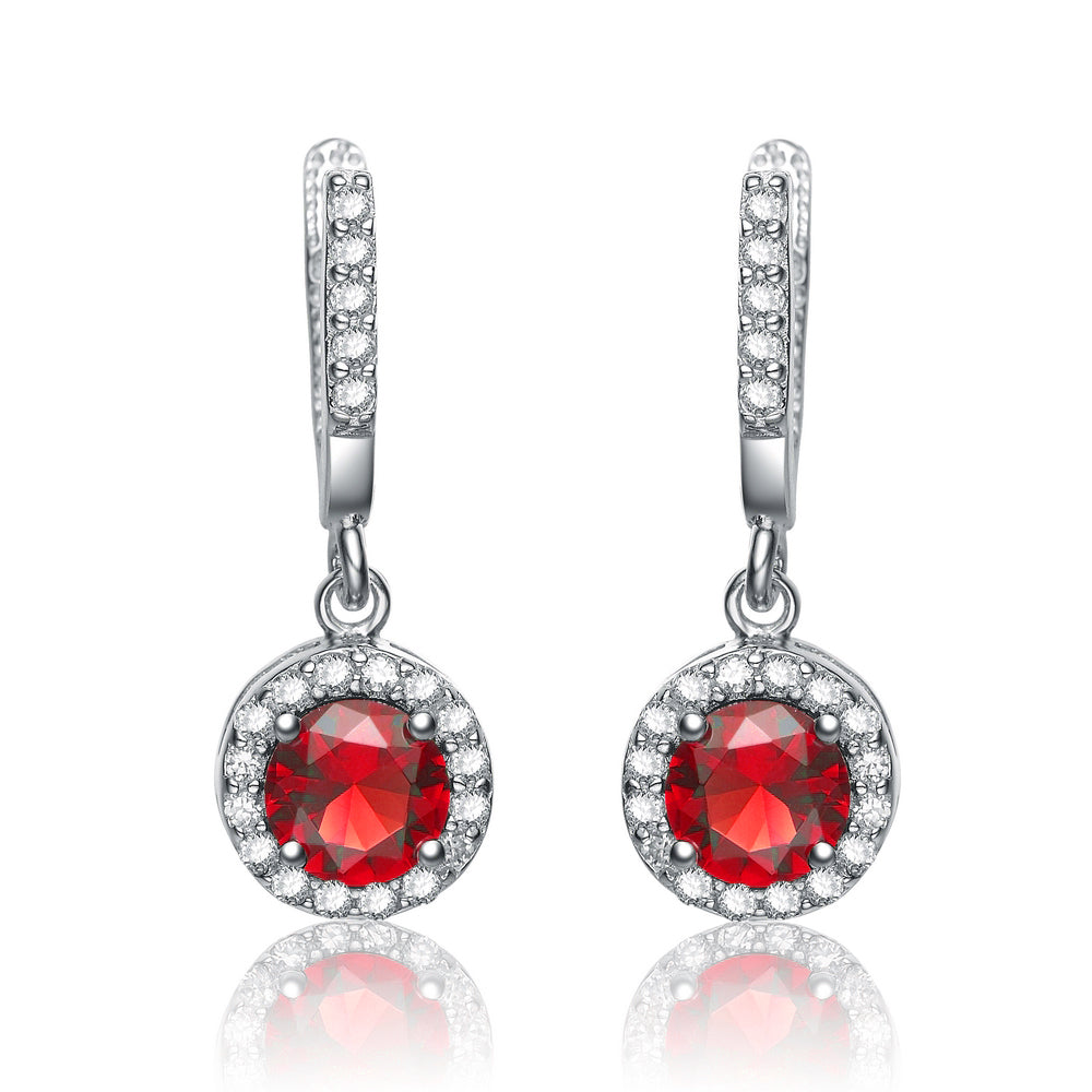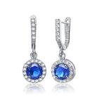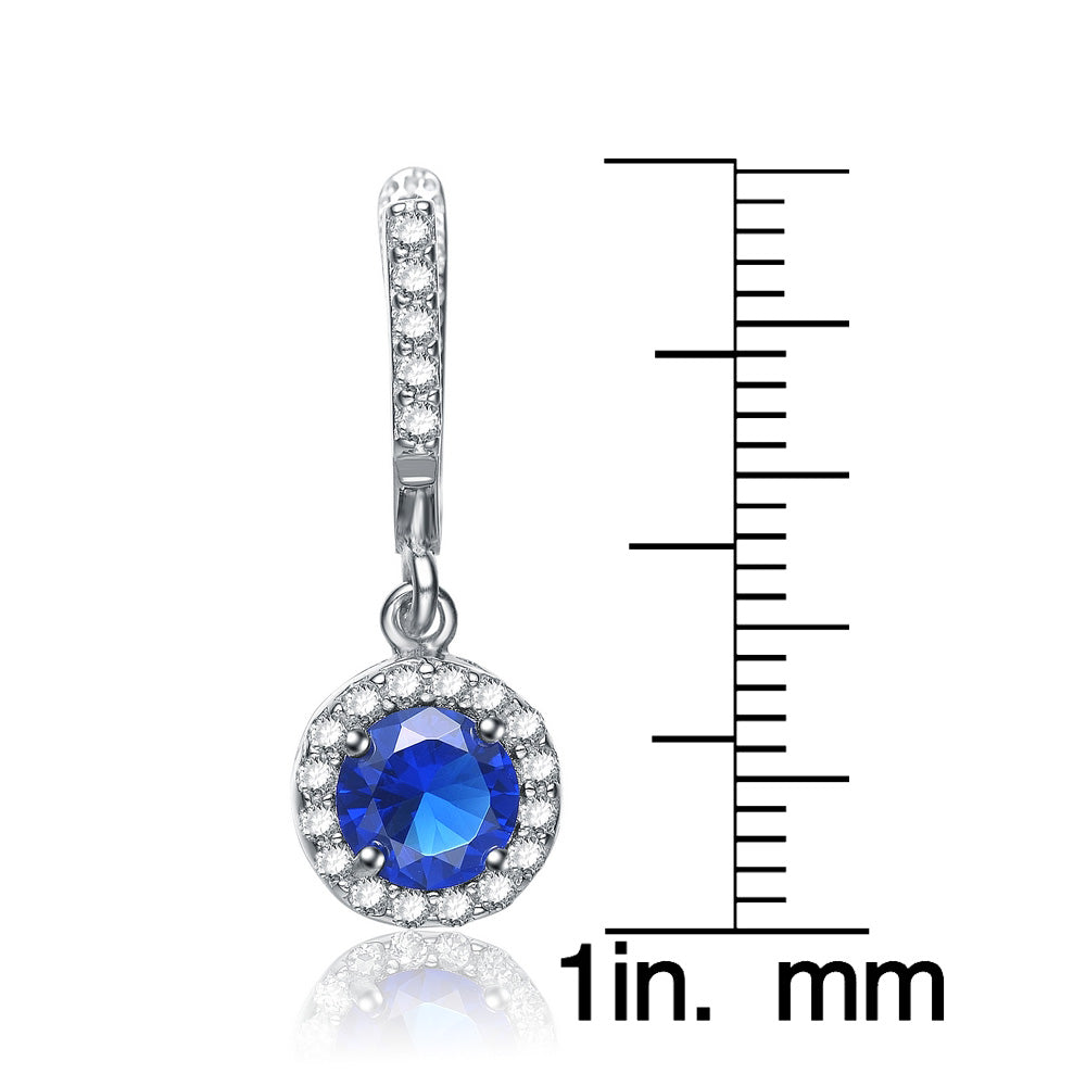 Dazzle your admirers, and draw the envy of your rivals with these sparkling cubic zirconia earrings. Your choice of either a blue,Red or green stone is surrounded by the shimmer of 42 white cubic zirconias, all in a sliver setting