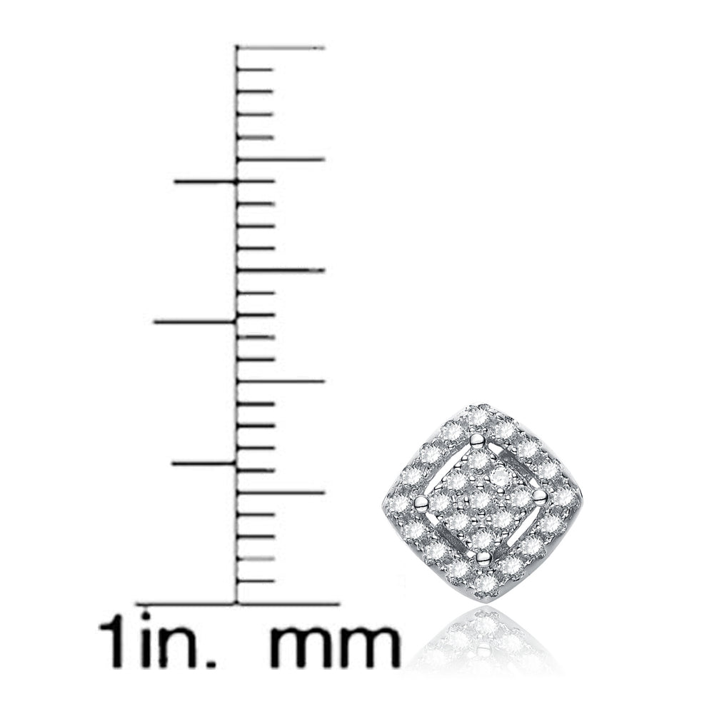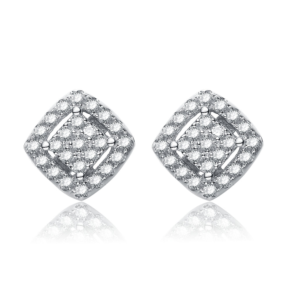 These neat square stud style earrings feature white round-cut cubic zirconia stone in prong setting. Crafted of .925 sterling silver, the earrings secure with butterfly clasps.