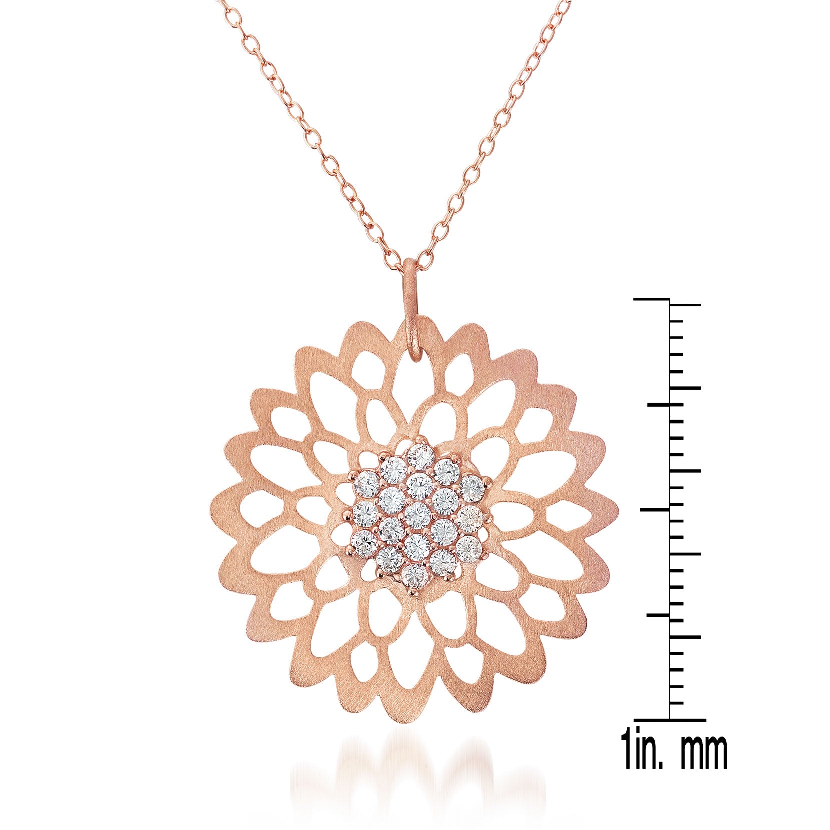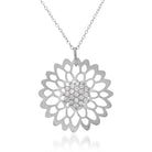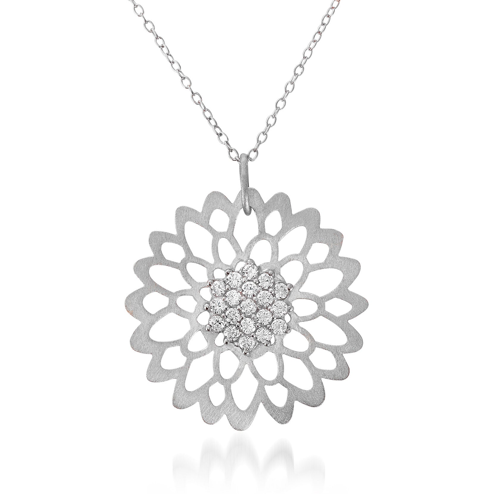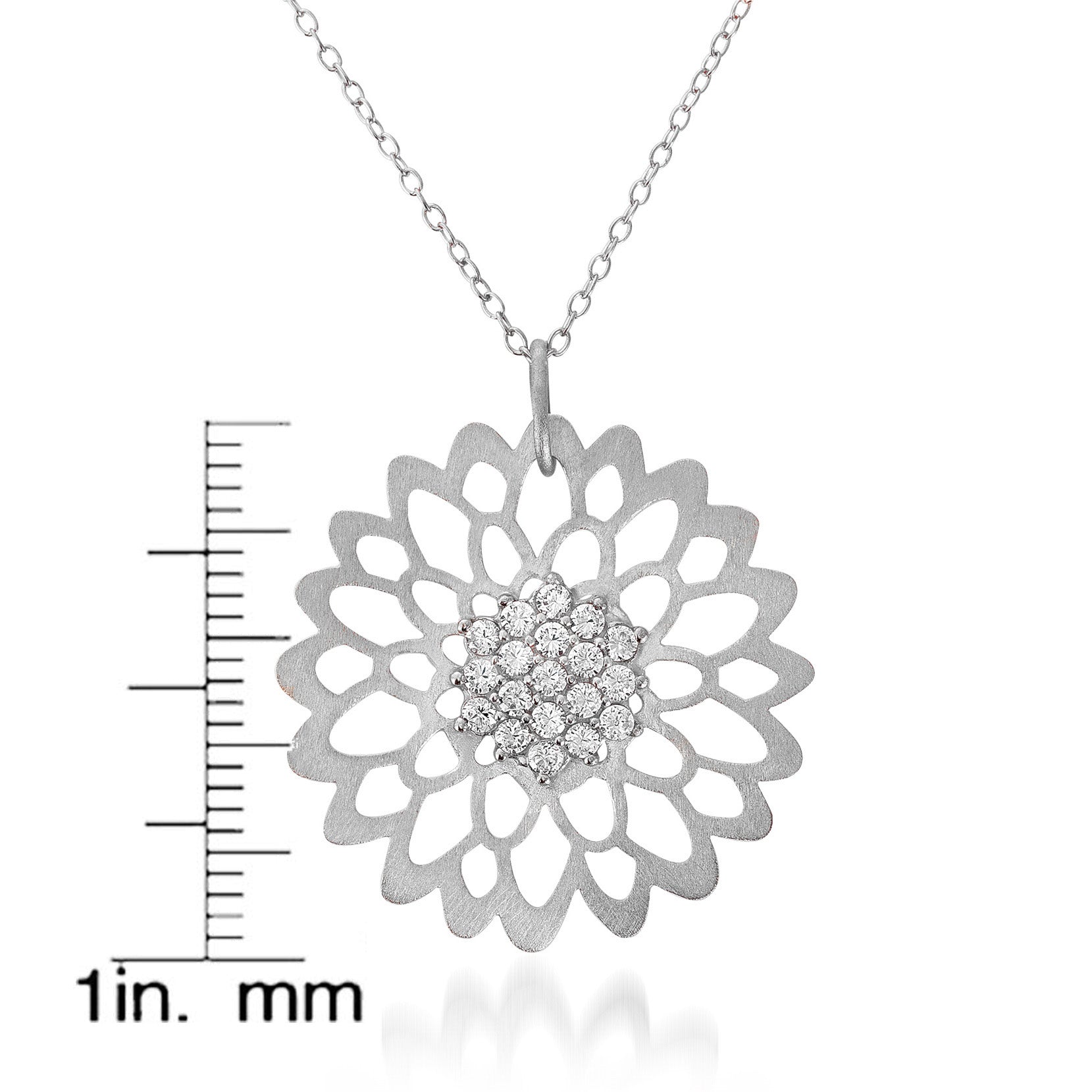 This nice pendant features white round-cut cubic zirconia stones decorating a matte flower lace design. Crafted of .925 sterling silver, the necklace secures with a spring ring clasp. Whether worn for a special occasion or as a statement piece, it’s sure to turn heads and capture attention.
