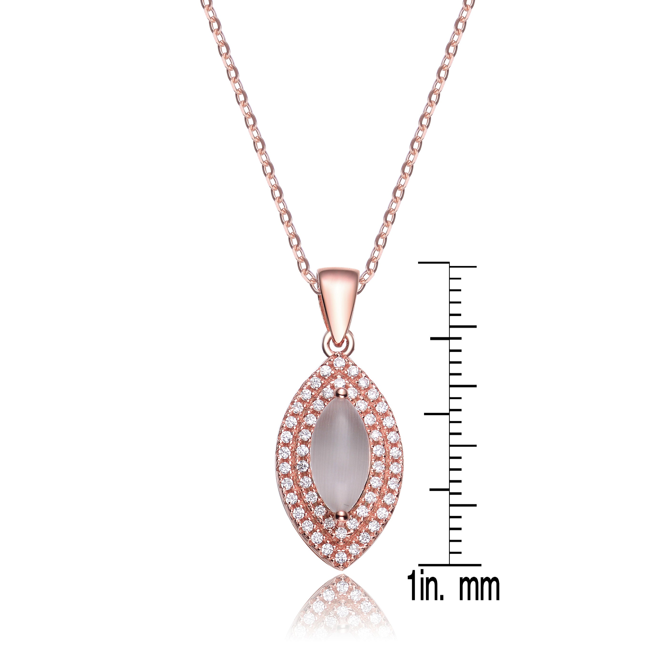 A pearly marquise cubic stone sits atop a blazing array of cubic pellets which decorate a double outer layer of rose tinted silver. A rose plated silver loop hooks this treasure up to its rose silver rolo chain, lending an air of dexterity to this necklace.