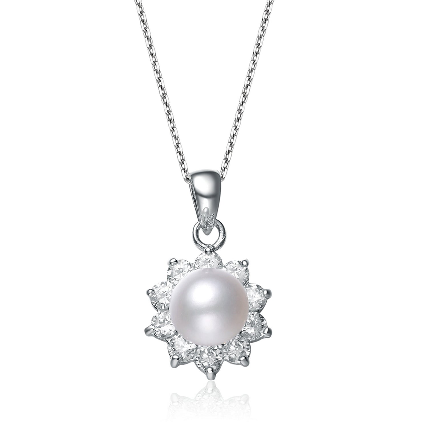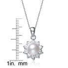This rich pendant features a faux white pearl sorrounded with round-cut cubic zirconia stones. Crafted of .925 sterling silver, the necklace secures with a spring ring clasp