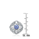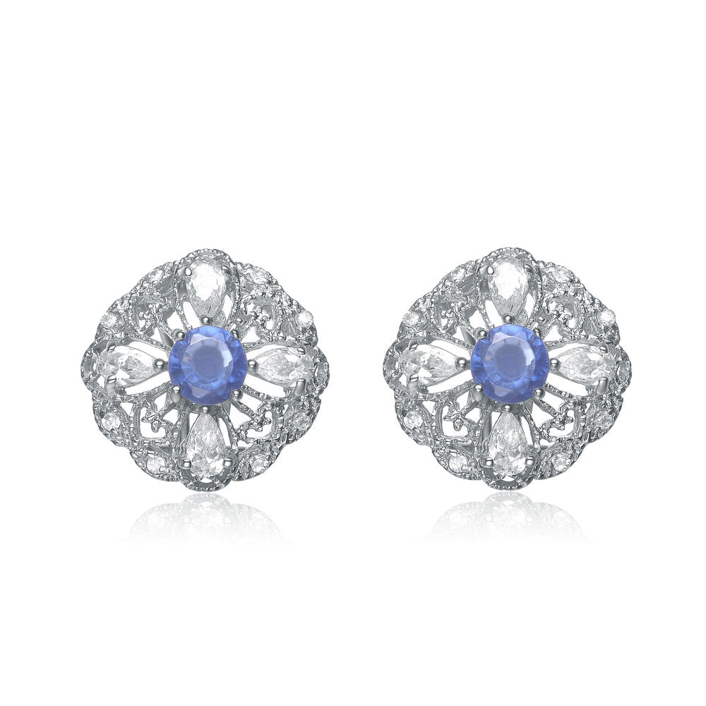 These earrings are adorned with a beautiful round cut sapphire cubic zirconia in center sorrounded by four pear shaped clear cubic zirconia.