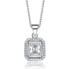 A lustrous pendant that will be just the right accent piece for any look. A rectangular-cut center stone is surrounded by a halo of round-cut cubic zirconia all set in .925 Sterling silver.it comes with an 18 inch chain and has a spring ring closure.