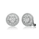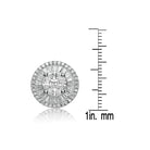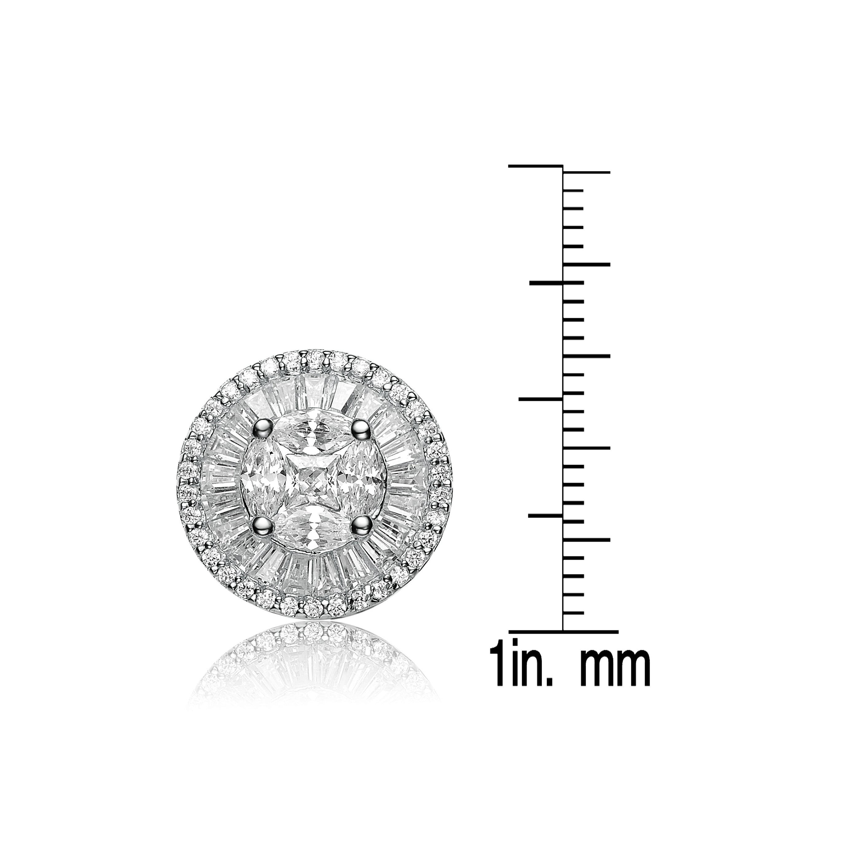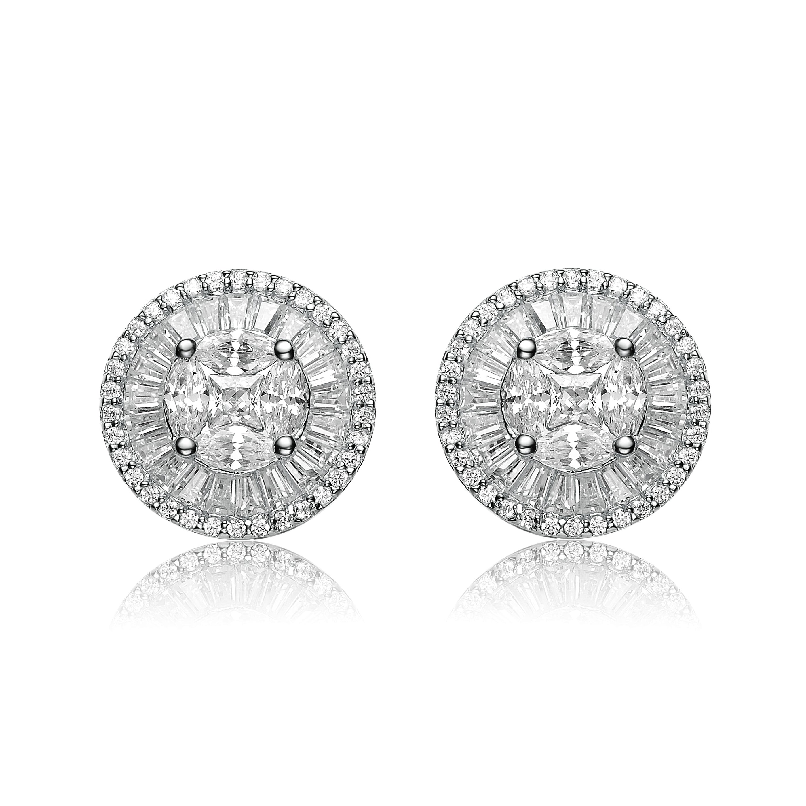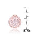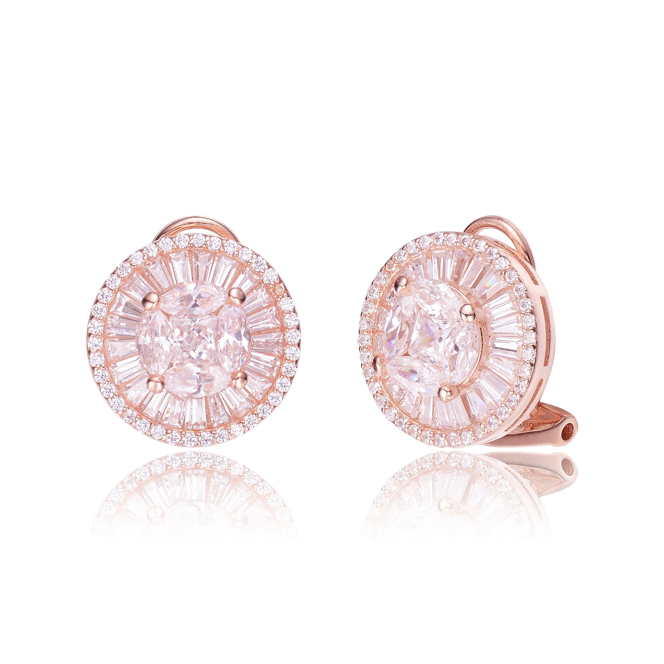These stud earrings yell sophistication with a hint of royalty. A large round cubic stone graces the front base and is flanked by a circled row of tiny cubic rectangular gems, and surrounded yet futher by a circling row of tiny round glimmering cubic stones. The foundation framing each stone is a blanket of rose colored silver, accentuating its clear cubic counterparts for a powerful stand-out.