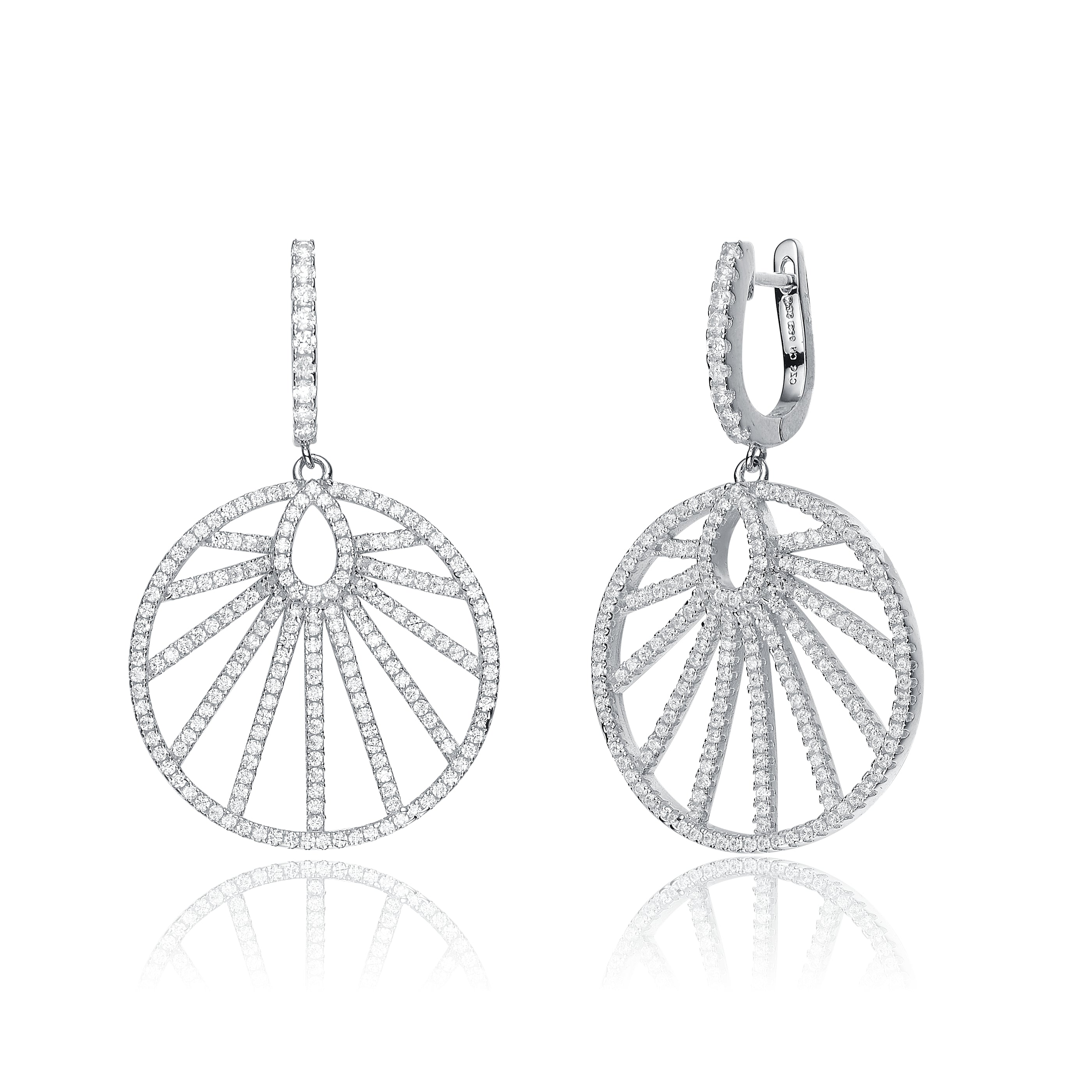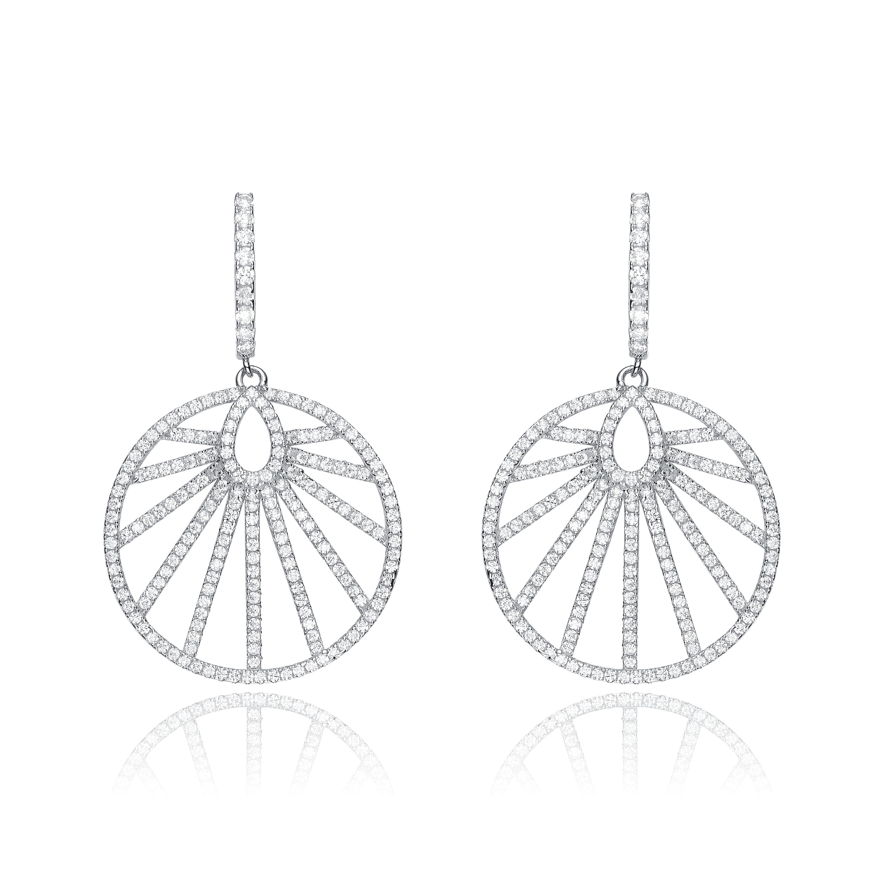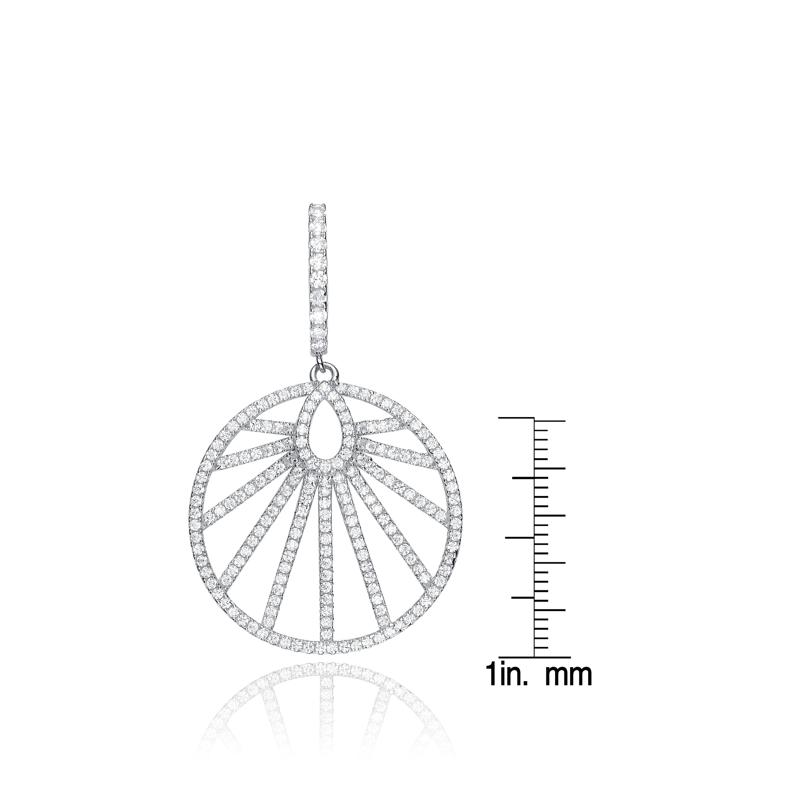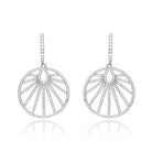 Bits of blazing cubic zirconia set in fine sterling silver amass a large wheel of fluctuating inside rows for a cultured look. The wheels hang from equivalently decorated rectangular cutlets to complete these fine drop earrings.
