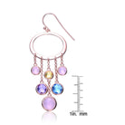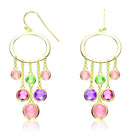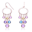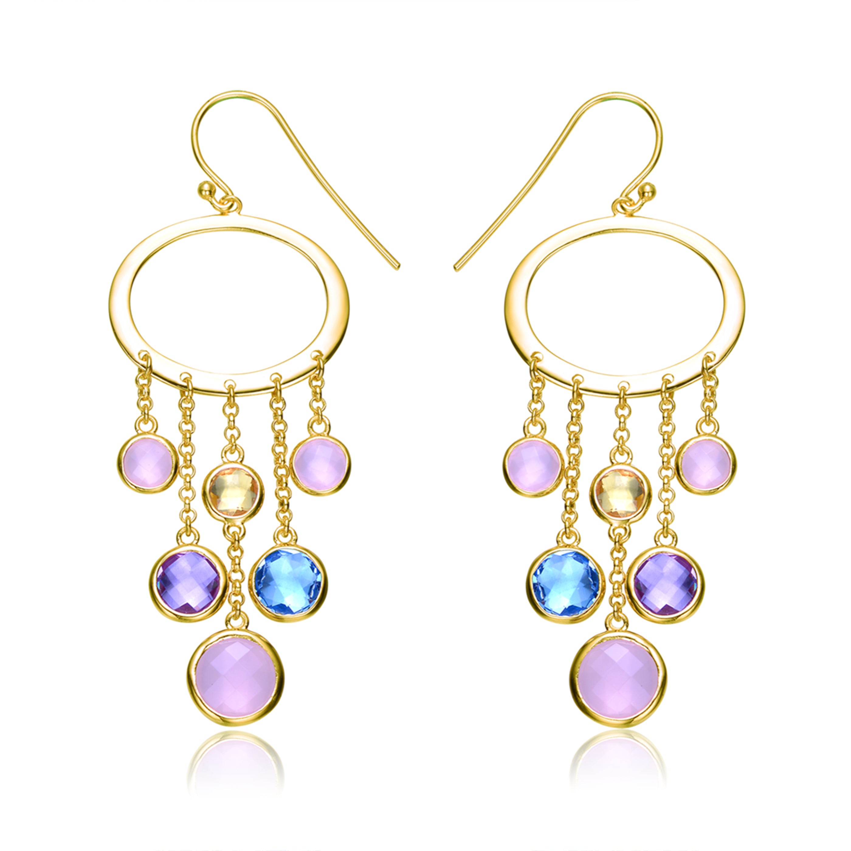 These beautiful sterling silver gold tone plated chandelier earrings are adored with sparkling purple, blue, and yellow CZ round stones. These beautiful earrings are secured with fish hooks. Each stone hangs individualy froma single hoop. Available in rose gold plating as well.