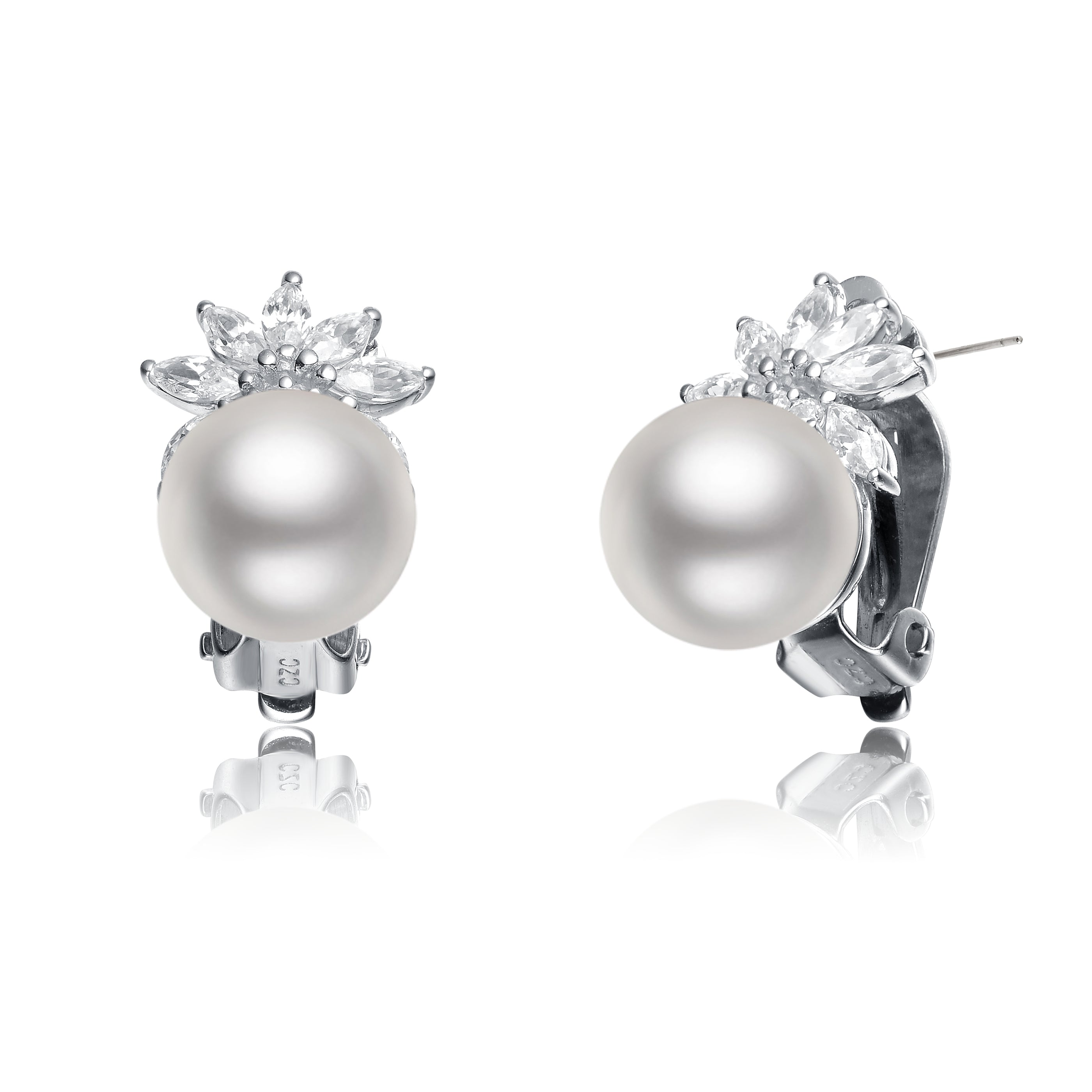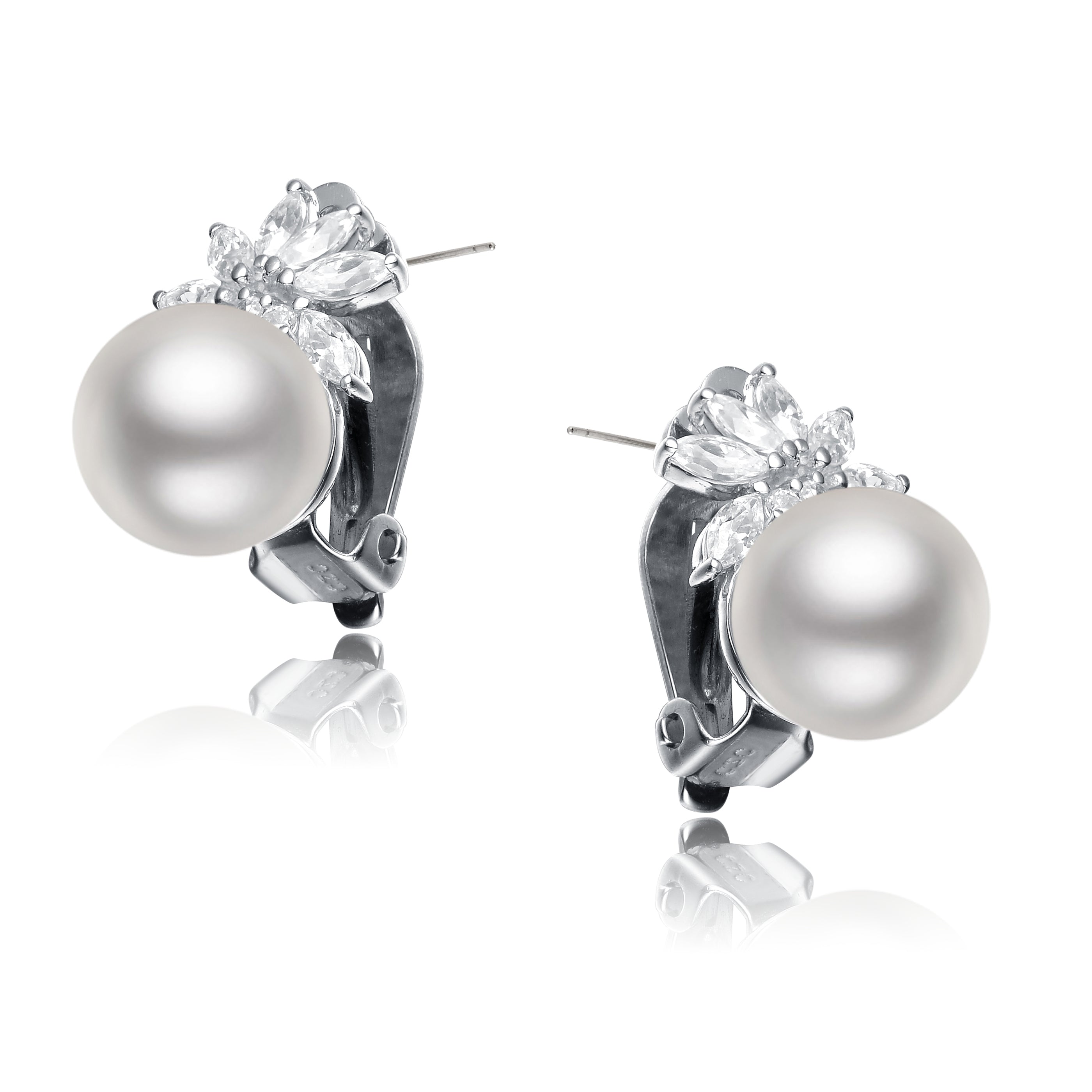 These fine faux pearl earrings are enhaced with whitee round-cut cubic zirconia stones. Crafted of .925 sterling silver, the earrings secure with omega clasps.