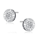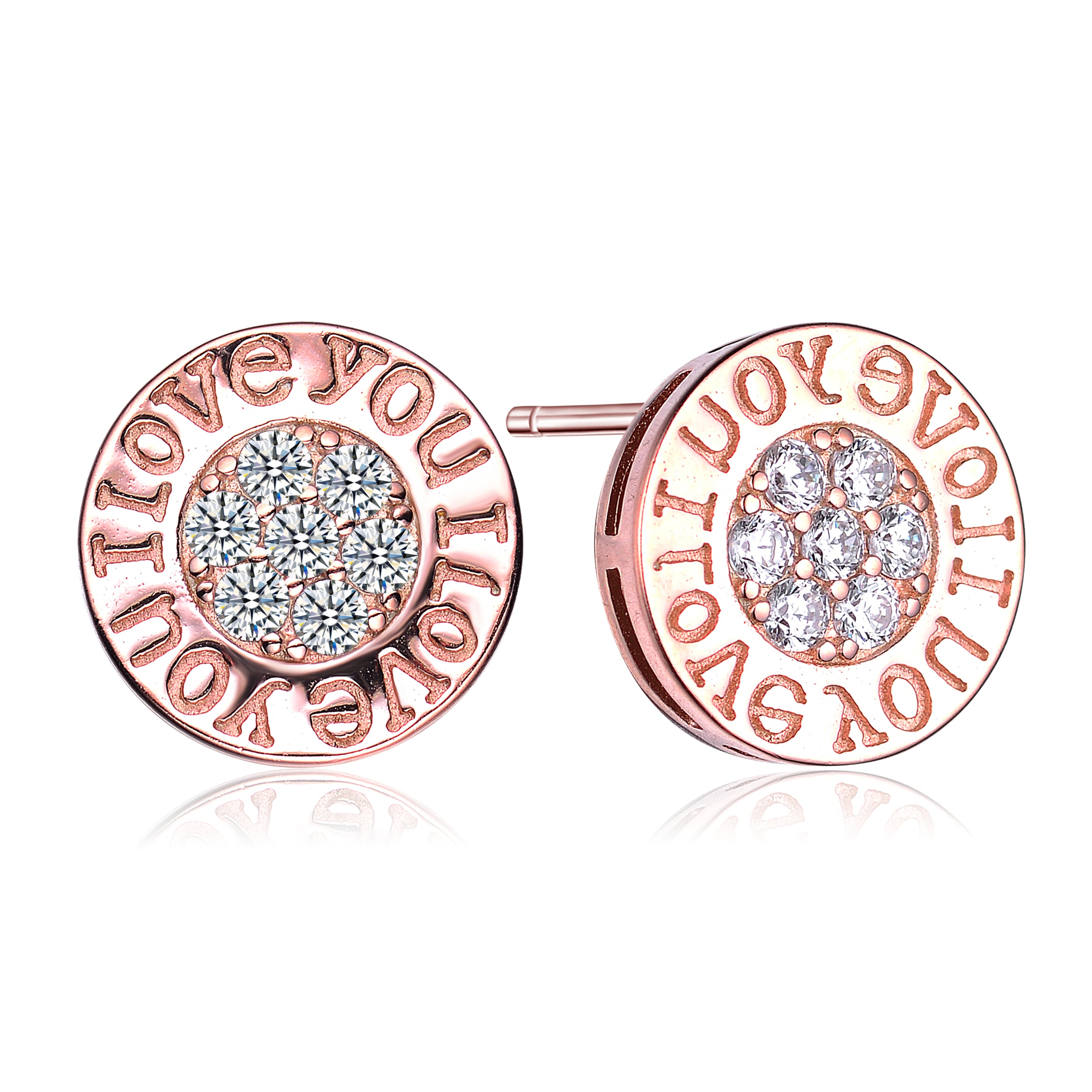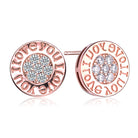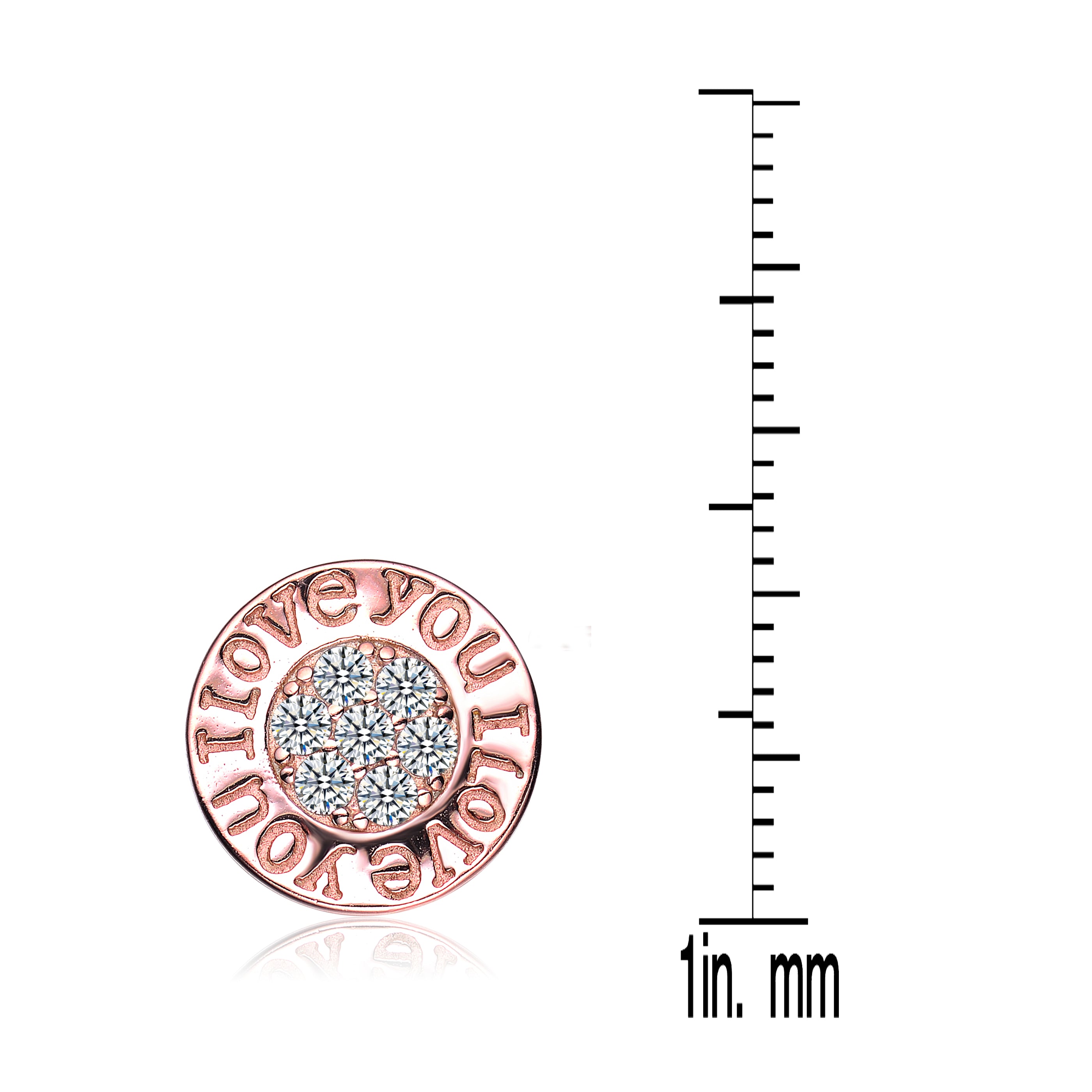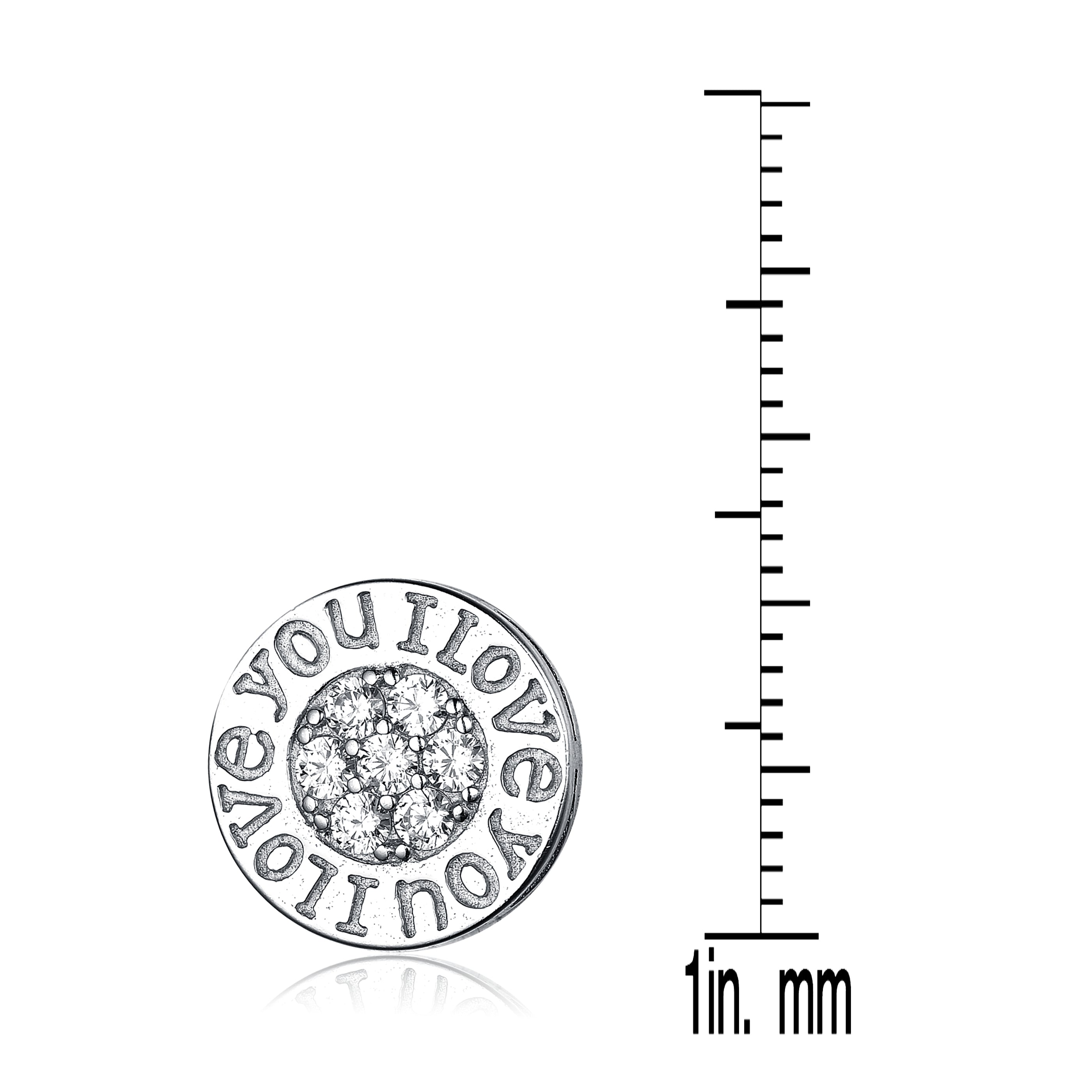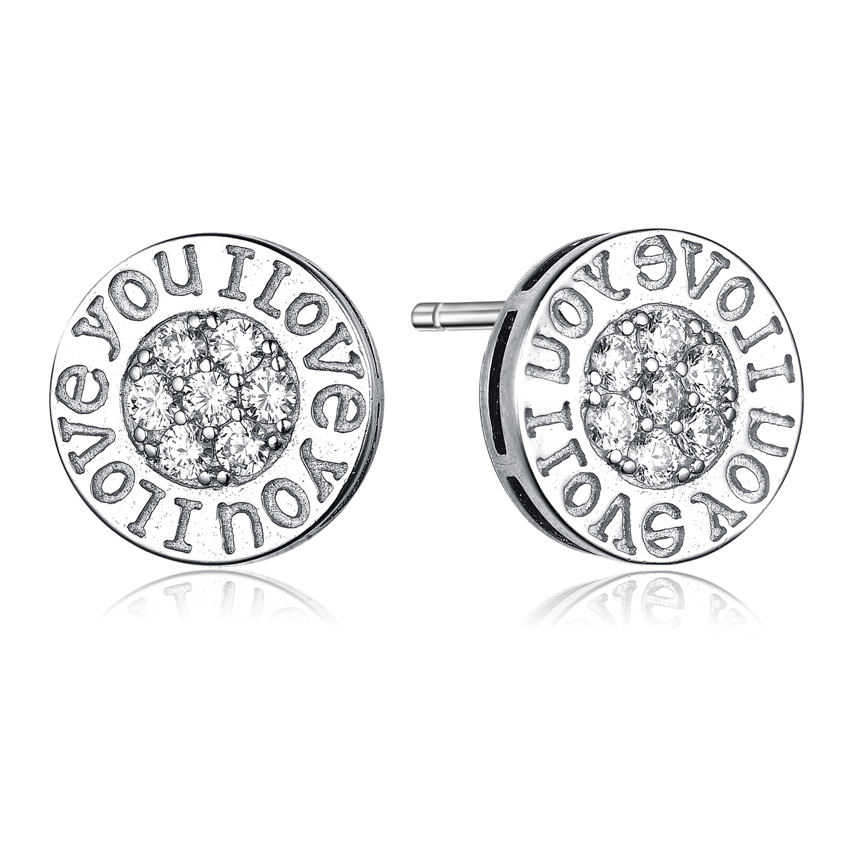 These round "I Love You" earrings are decorated with dazzling white round-cut cubic zirconia stones. Crafted of .925 sterling silver the earrings secure with butterfly clasps.