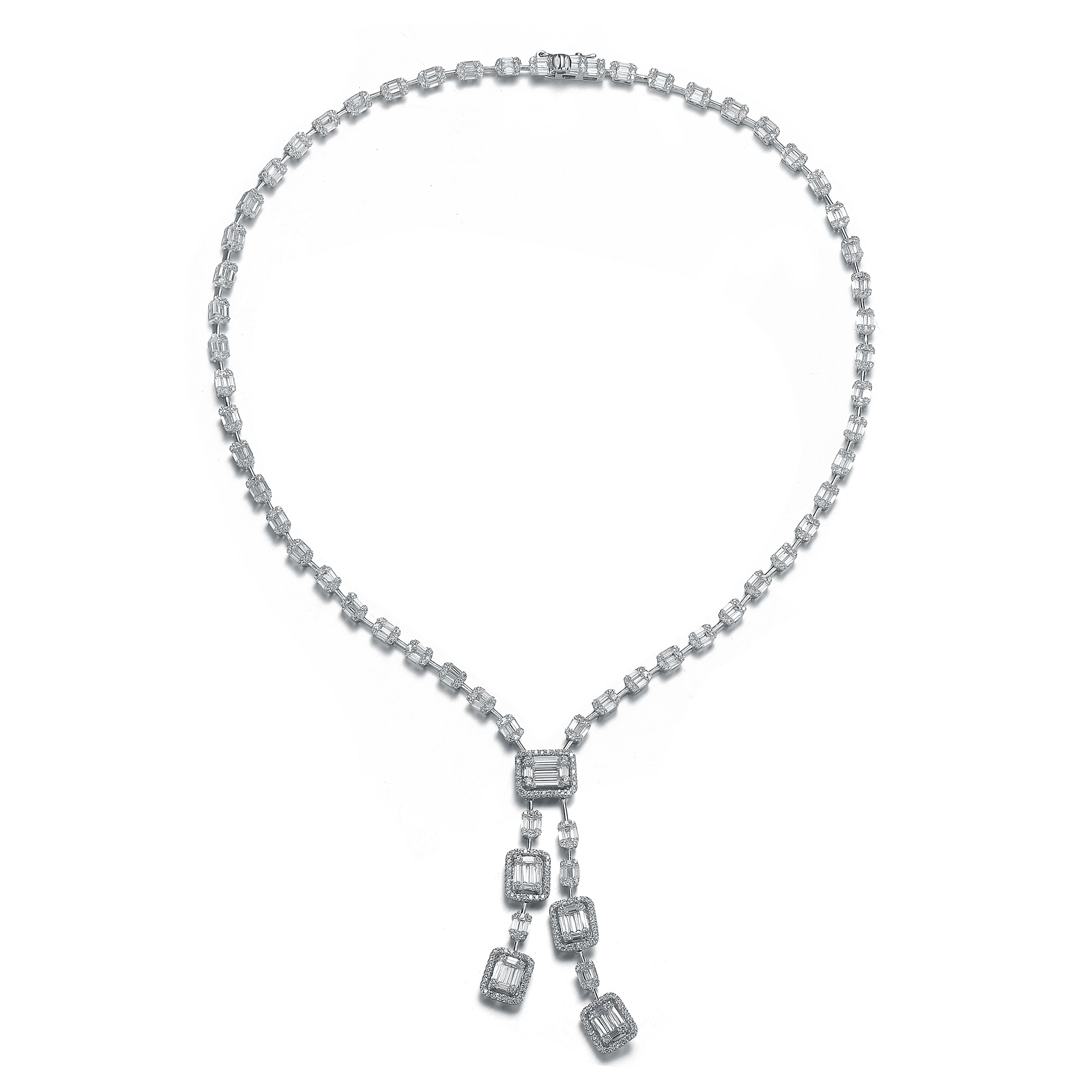 Unique style connected rectangular clear white cubic zirconia with square trinket with cluster of mini clear cubic zirconia hanging as pendant. This unique necklace is made from sterling silver with toggle clasp.