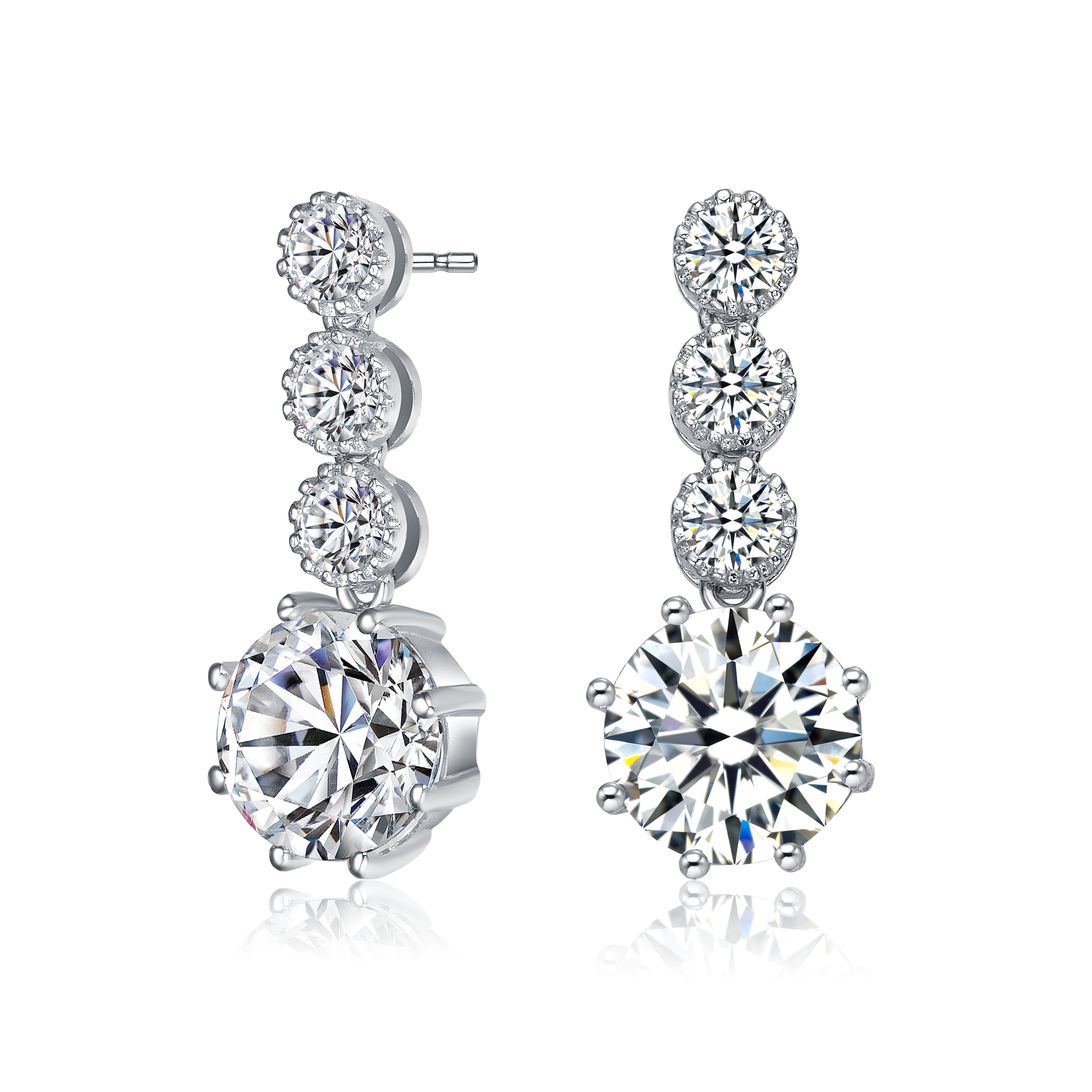 Classy Sterling Silver with Rhodium Plated Drop Earrings.A vertical orientation of clear round Cubic Zirconia is the main feature of these earrings. A large clear round Cubic Zirconia is set on the bottom and it continues up trailed with small clear round Cubic Zirconia stones set in decorative bezel setting. Crafted in Sterling Silver in Rhodium Plating and secures with butterfly clasp. These earrings are perfect for a day at work or for a fun night.