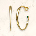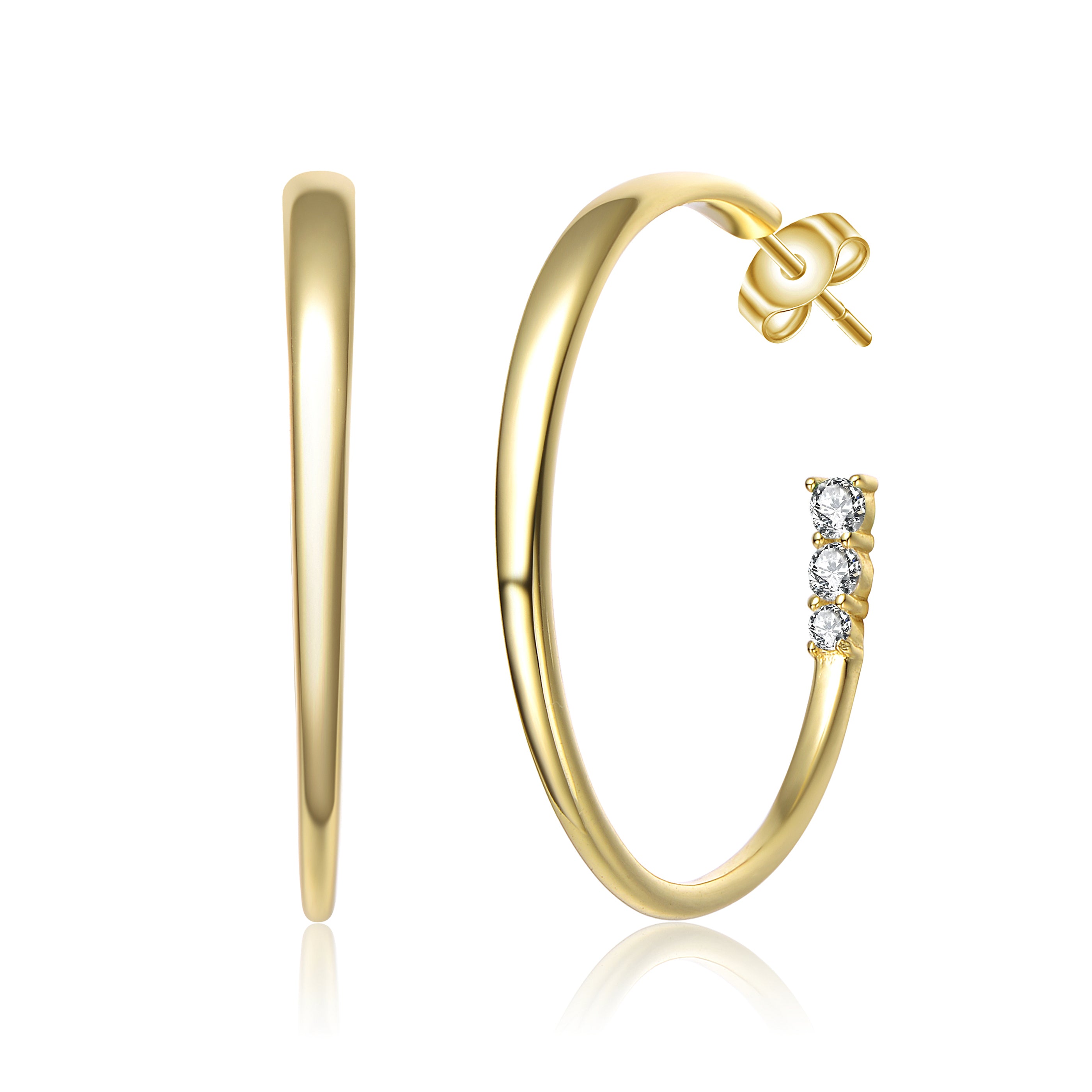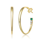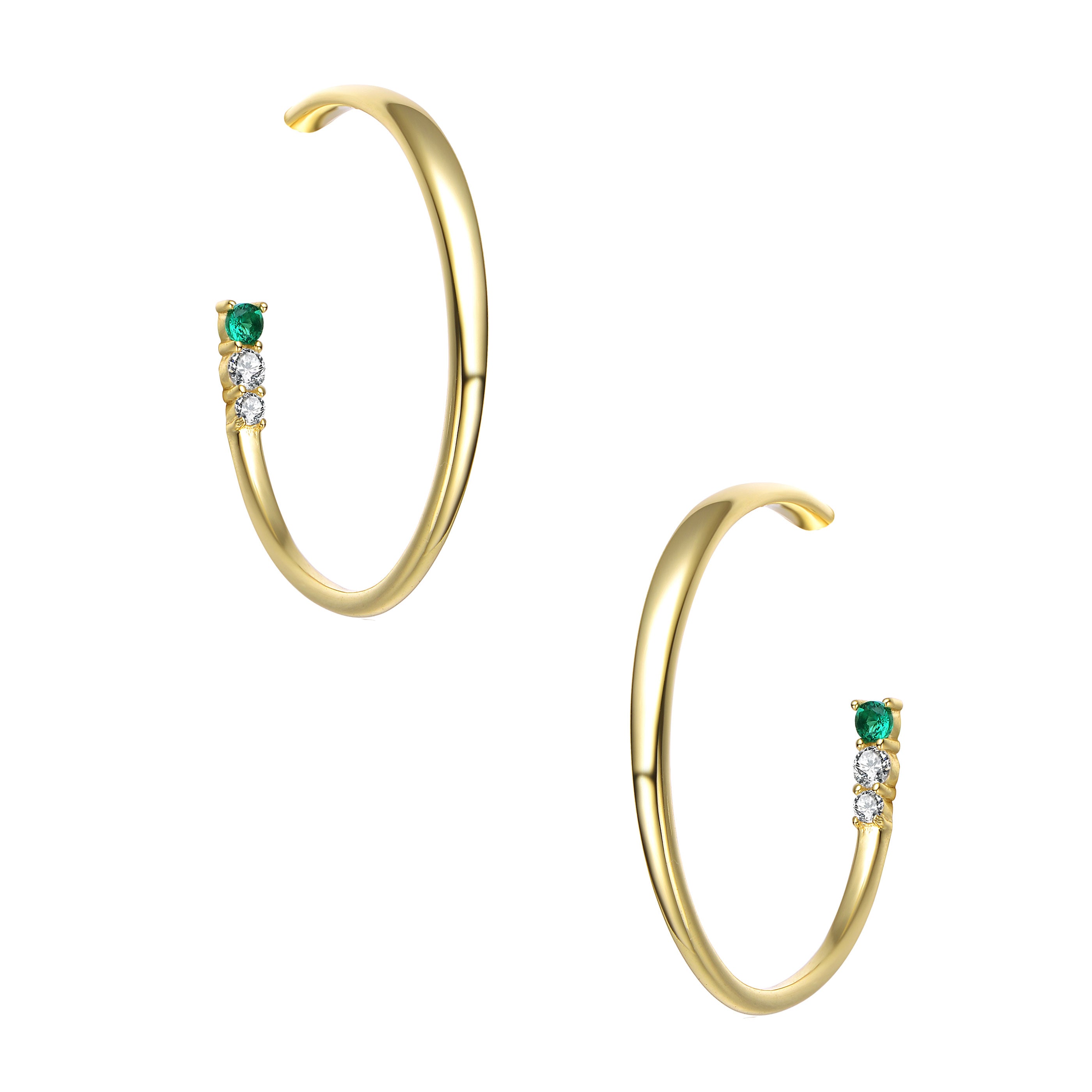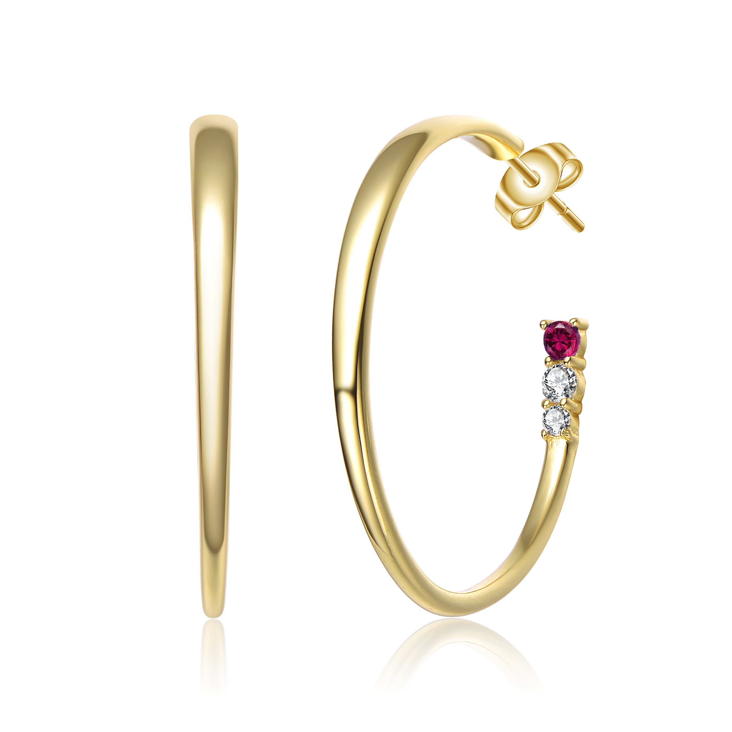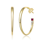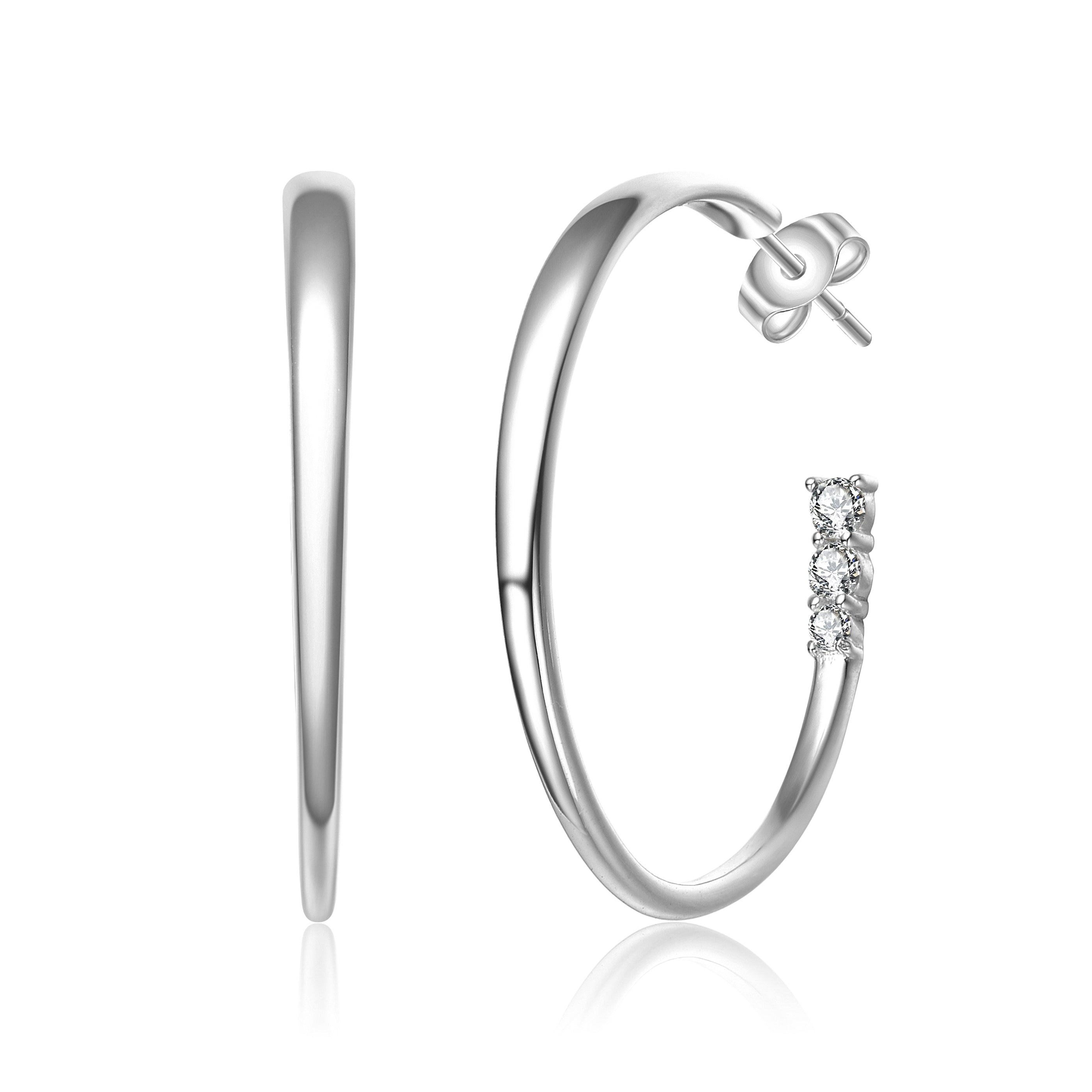 These elegant open c-hoop earrings glitter with round brilliant cut -like cubic zirconias set in a 3-stone past, present, and future style setting. Butterfly backs secure these pretty hoops, all in a rhodium-plated sterling silver finish. Available in different stone color options.