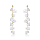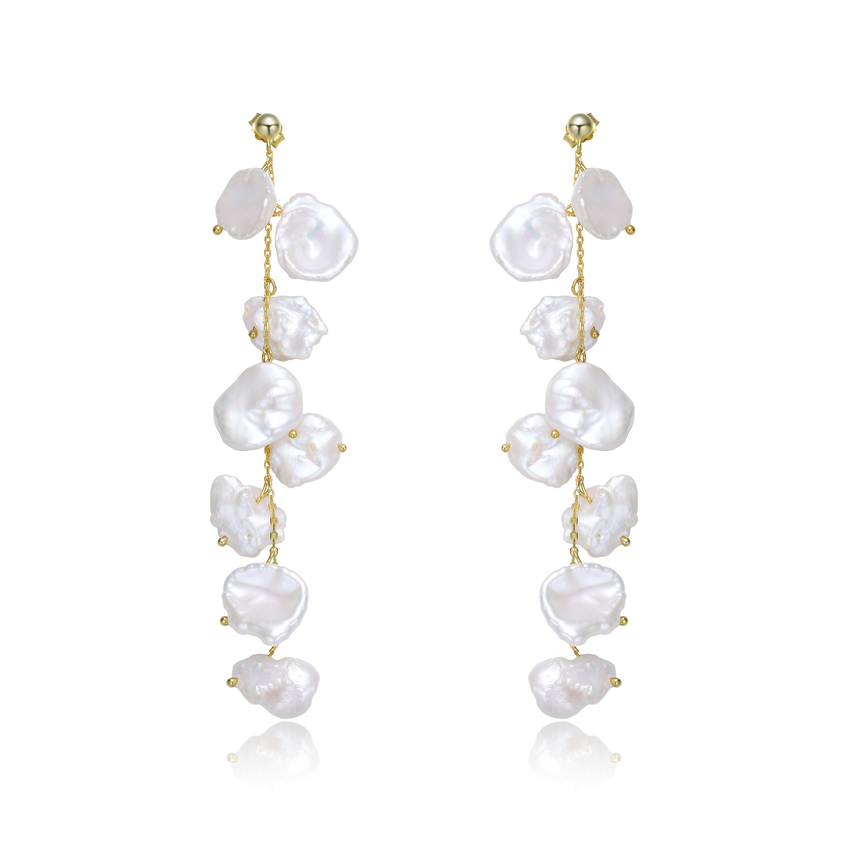 Elegant Sterling Silver with Gold Plating and Freshwater Pearl Dangling and Drop Earrings. This beautiful pair boasts of unevenly-cut Freshwater pearls that drop and dangle forming the earrings. Crafted in .925 Sterling Silver, the piece is secured with a butterfly clasp. These are perfect for a formal event.