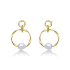 Elegant Sterling Silver with Gold Plating and Freshwater Pearl Dangling Earrings. These earrings boast of dangling gold plated metal hoops with Freshwater pearls that run through at the center of each hoop. There are also hoops that link to it near the clasp. Crafted in .925 Sterling Silver, the piece is secured with a butterfly clasp. These are perfect for a formal event. It is also a great present for a special ocassion.