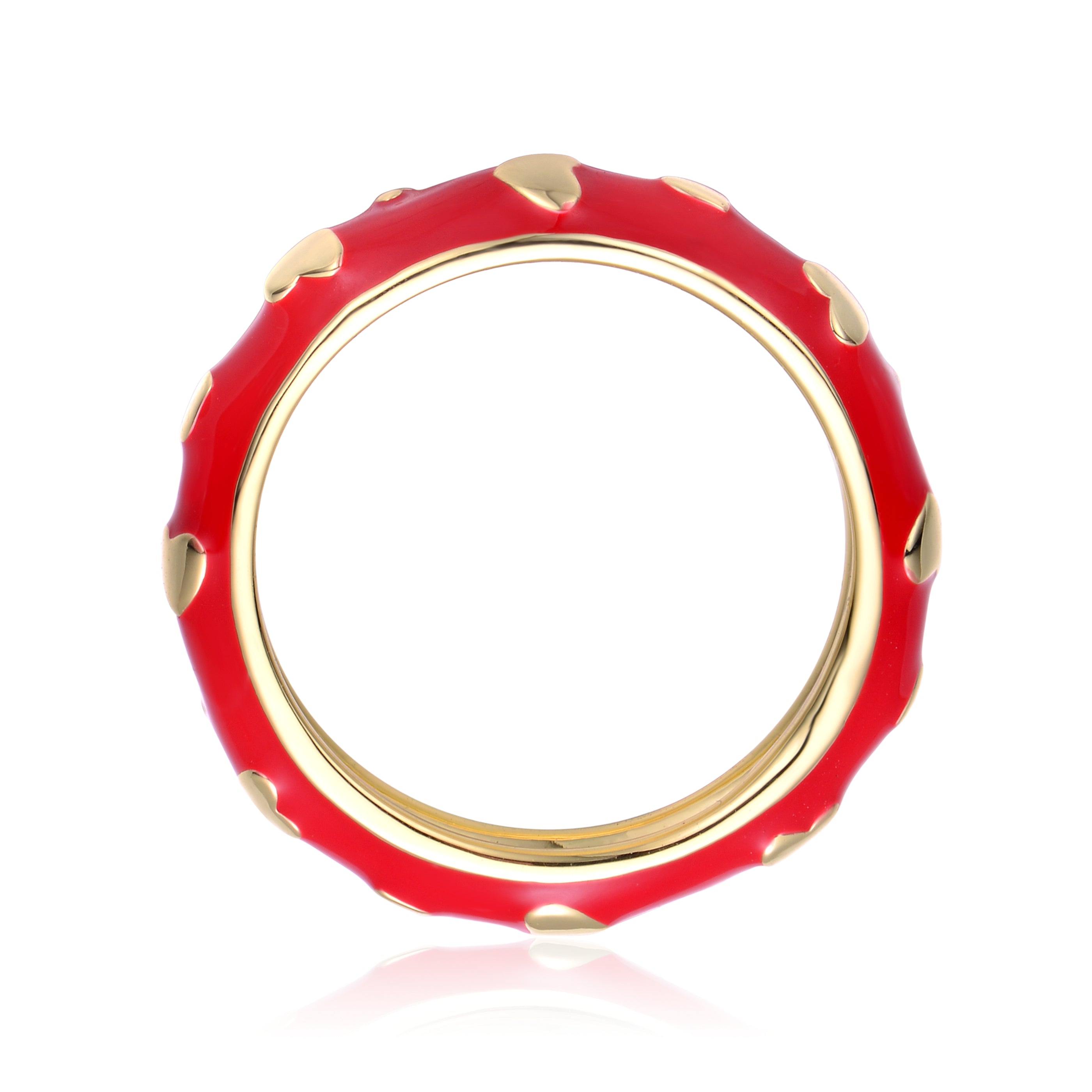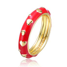 Sterling Silver 14k Yellow Gold Plated Red Enamel Heart Stacking Band. Select this sweet 14k yellow gold plated band as a gift for your daughter, bestie, or family member as a token of your memories. Shiny hearts stand out against a Red enamel coating on the top, giving this dome-shaped band a unique look filled with meaning and vibrancy. Stack this ring with other bands for a daily look that is right on-trend. Available in ring sizes: 6-7.