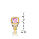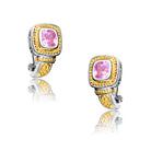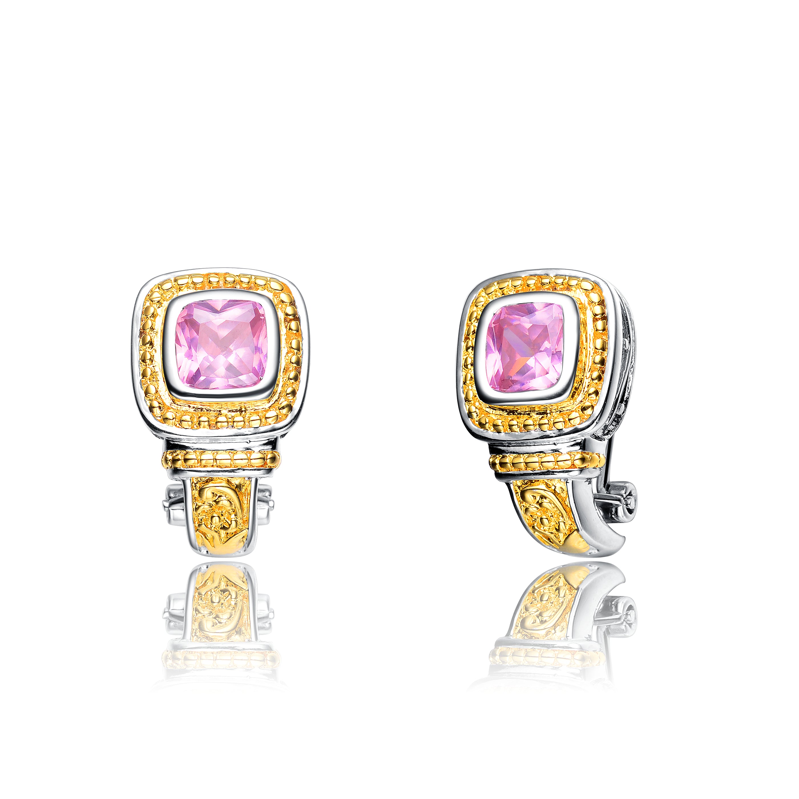 In a shade of classic yellow gold, these earrings are still youthful and fun. The pink center stone is surrouned by gold plating.Β