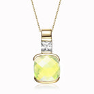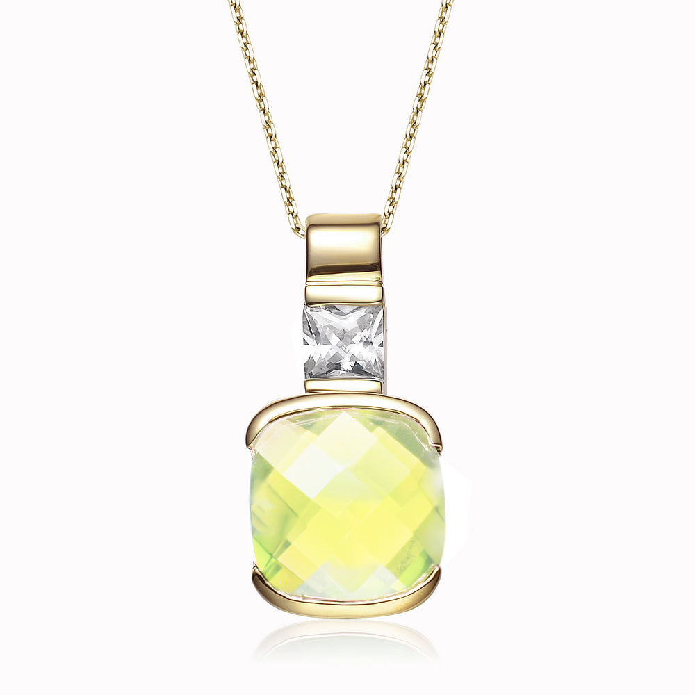 This sophisticated pendant features a large, cushion-cut cubic zirconia with a radiant yellow hue, elegantly mounted in a sterling silver setting. The pendant is suspended from a classic silver chain and is accented by a smaller, square-cut cubic zirconia set above the main stone, adding an extra touch of sparkle. This piece of jewelry combines timeless design with modern elegance, making it an interesting choice for those seeking to add a hint of luxury to their attire.