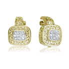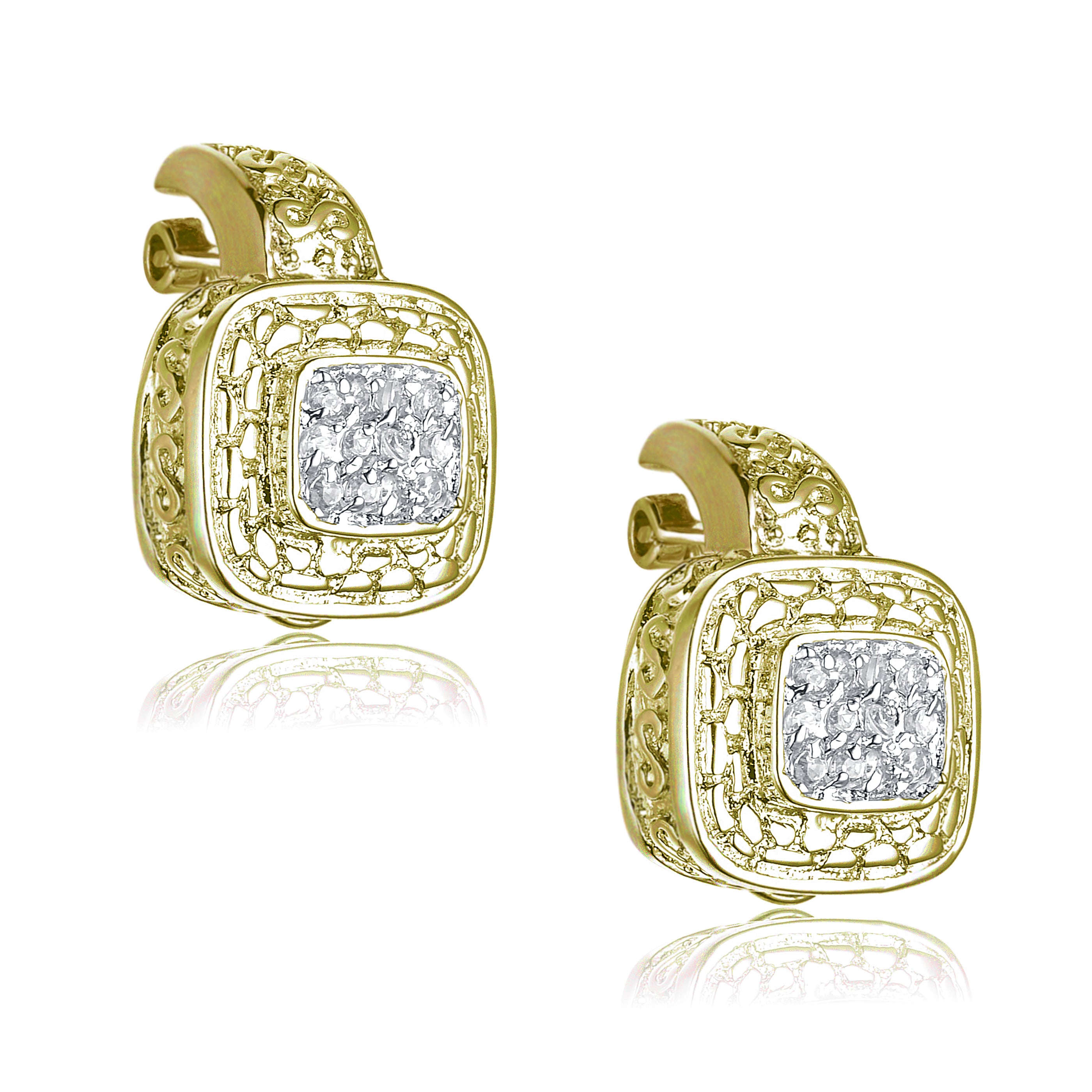 These exquisite earrings feature a sterling silver base with a luxurious gold plating, creating a radiant shine. The design showcases intricate filigree patterns surrounding a central square setting, which is adorned with sparkling cubic zirconia stones that mimic the brilliance of diamonds. The combination of the detailed metalwork and the dazzling faux gemstones makes these earrings a sophisticated accessory for any formal occasion or an opulent addition to everyday wear.