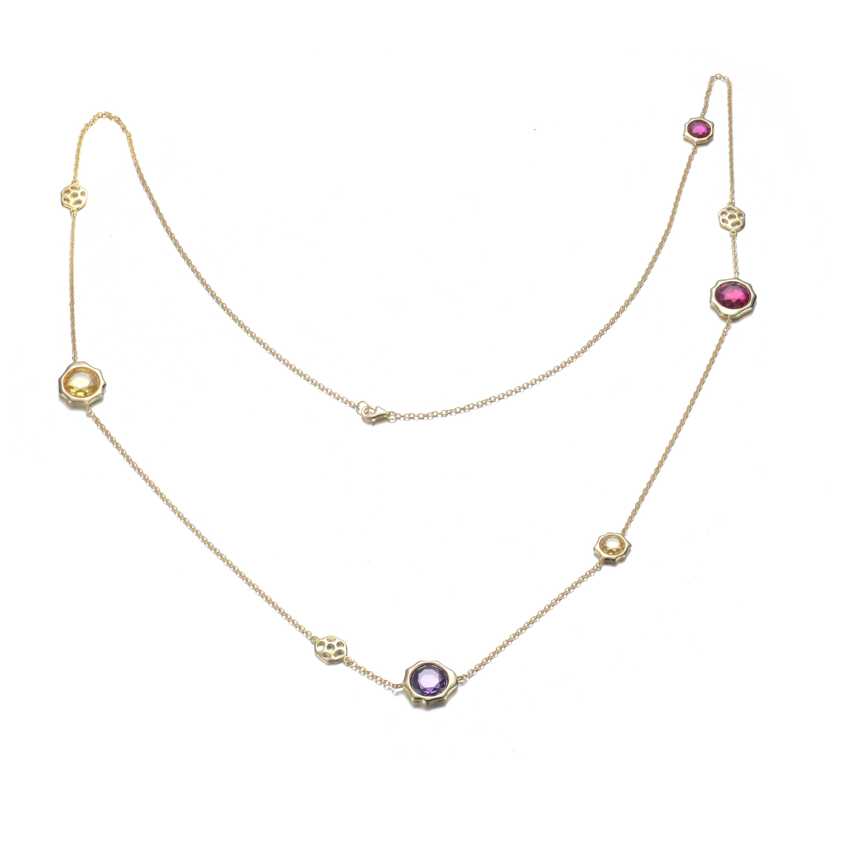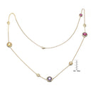 This beautiful by the yard necklace features red, purple and yellow round-cut cubic zirconia stones. Crafted of .925 sterling silver, with gold plating, the necklace secures with a spring ring clasp.