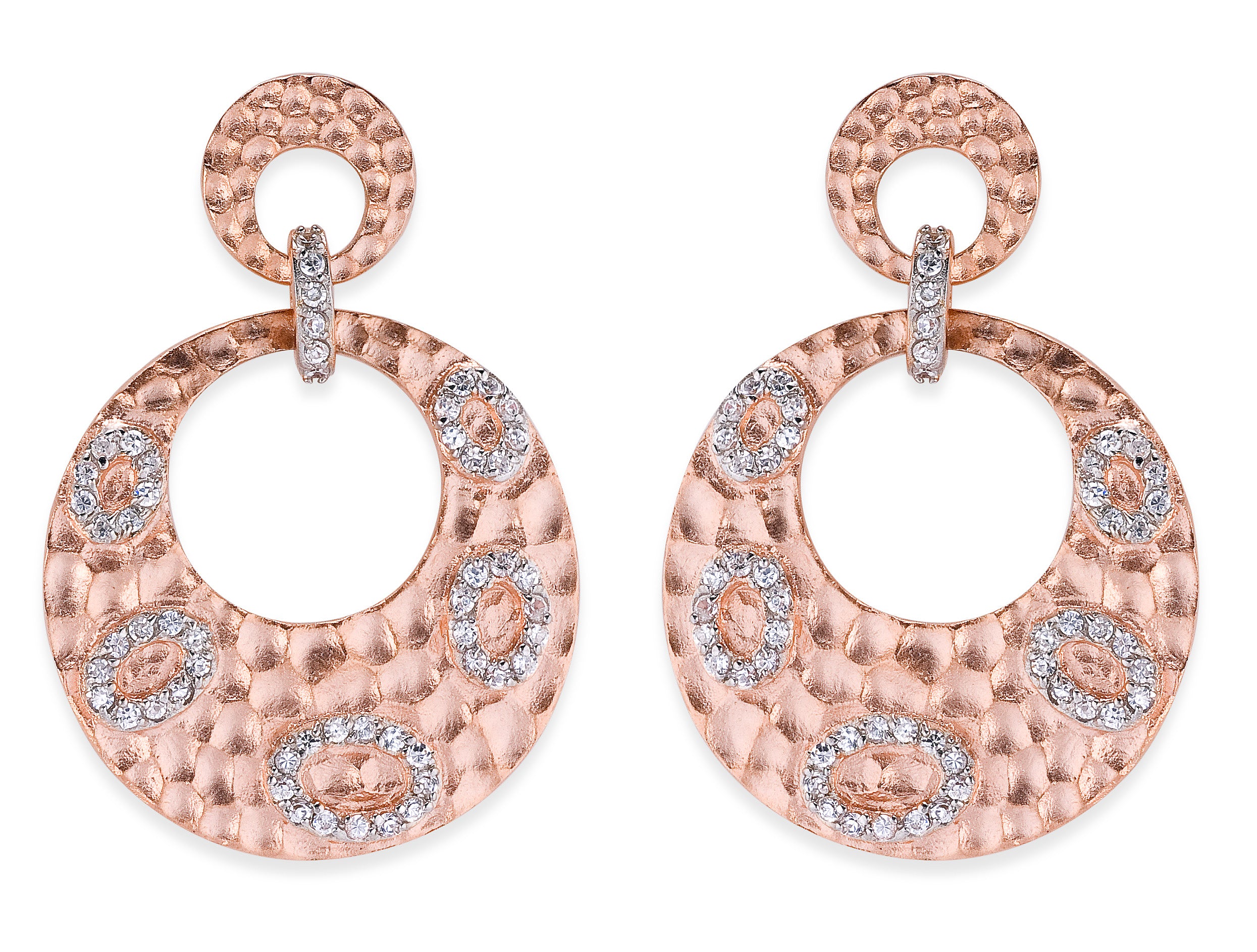 These distinctive earrings feature hammered rose gold plating and clear cubic zirconia accents. Wear them out to dinner, to work, or to dress up a casual outfit.